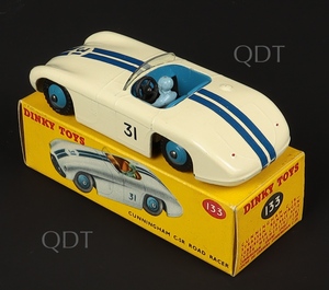 Cunningham C-5R Road Racer by Dinky Toys, No 133. Very near mint/boxed. Scarce version in OFF-WHITE, with a BLUE interior, blue-black door racing numbers. Bright, deep yellow picture box. From The Berlin Collection.