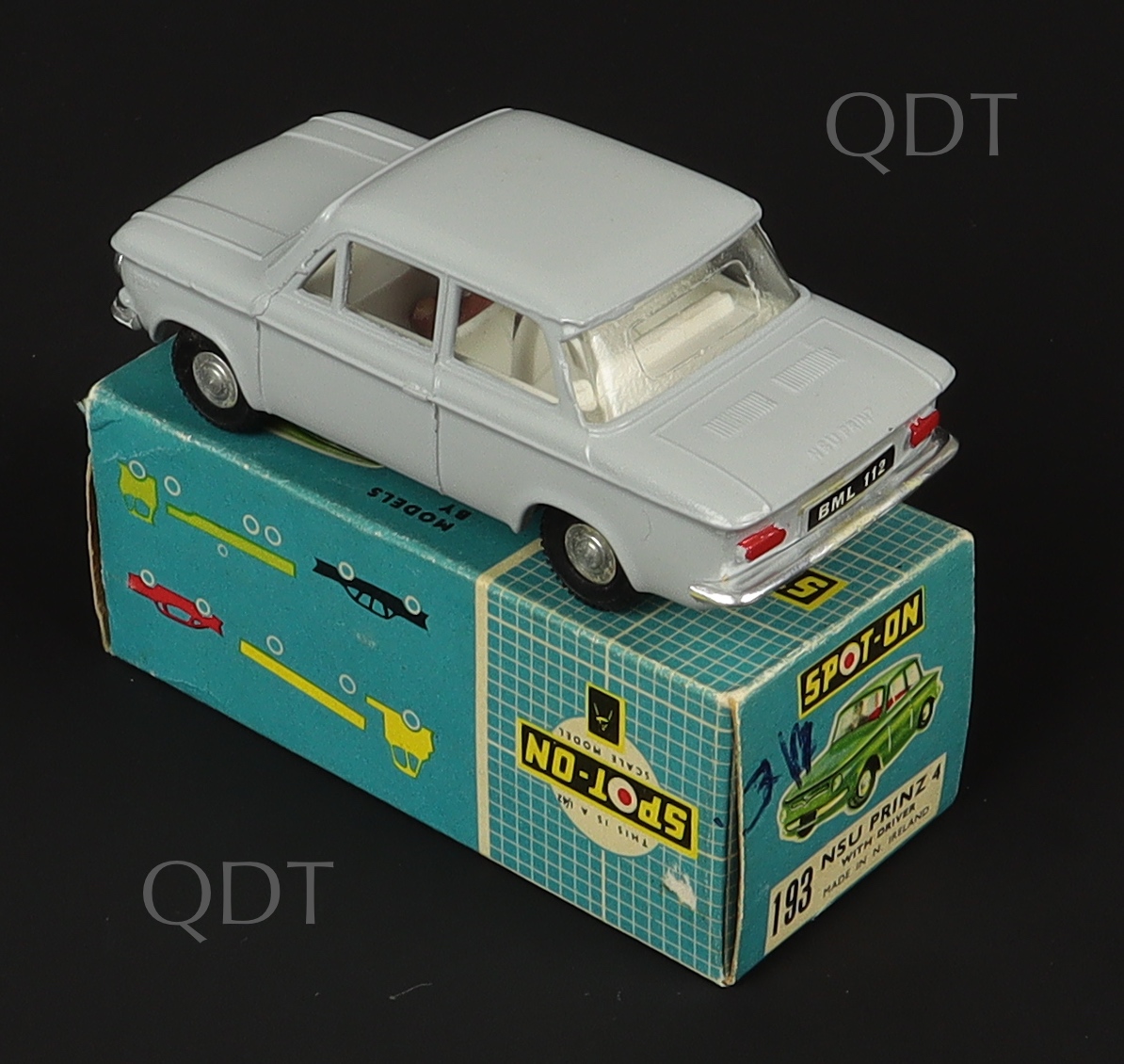 NSU Prinz 4 with driver by Spot-on Models, No. 193. Scarce in grey, white seats. Very near mint/boxed (lacks 1 internal end flap). With driver. From A Phenomenal Collection. Starting bid £150. Please note that QDT apply 12.5% buyer's commission.
