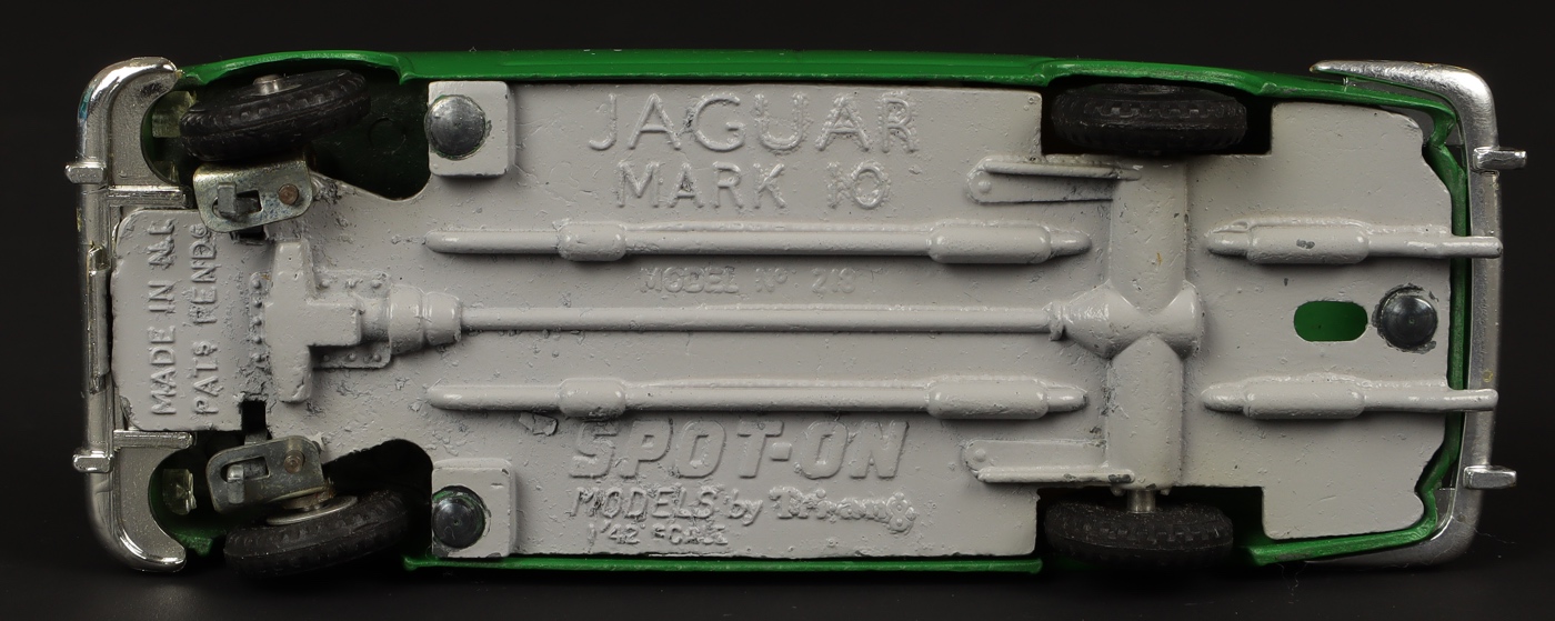 Jaguar MK. X y Spot-on Models, No. 218. Bright GREEN, lemon-cream interior. Very near mint/boxed, with Collector's Card & Leaflet. From The Borders Collection. Starting bid £200. Please note that QDT apply 12.5% buyer's commission.