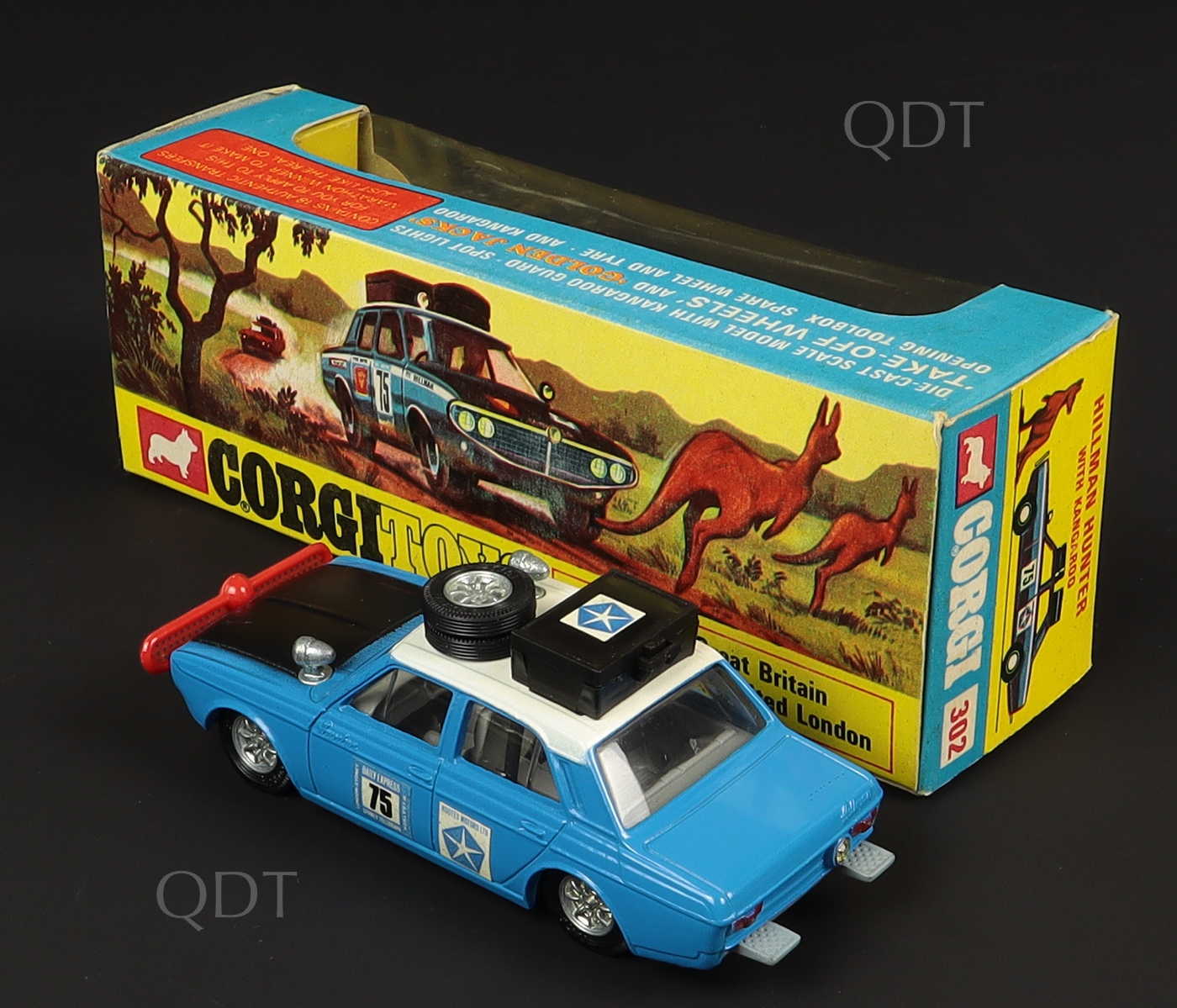Hillman Hunter Rally Car With Kangaroo by Corgi Toys, No. 302. Version with SILVER Golden Jacks. Very near mint/boxed. With leaflets and transfer sheet. 2nd issue box version WITHOUT 302 printed on box face etc. From The Berlin Collection.