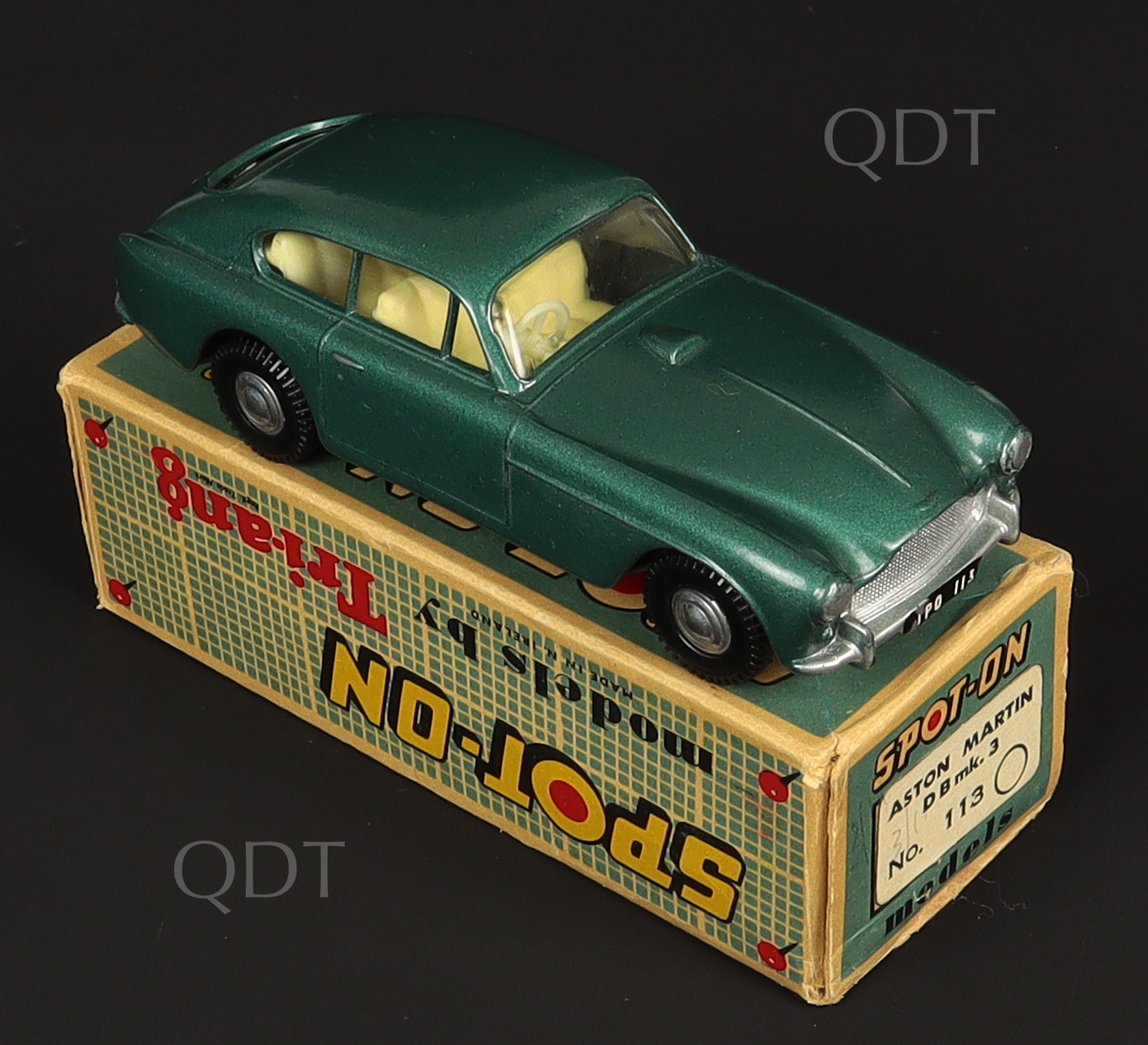 Aston Martin DB mk.3 by Spot-on Models, No. 113. Very near mint/boxed. Hard to find version in deep METALLIC GREEN with cream interior. With Collector's Card & Leaflet. From The Reigate Collection. Starting bid £250. Please note that QDT apply 12.5% buyer's commission.