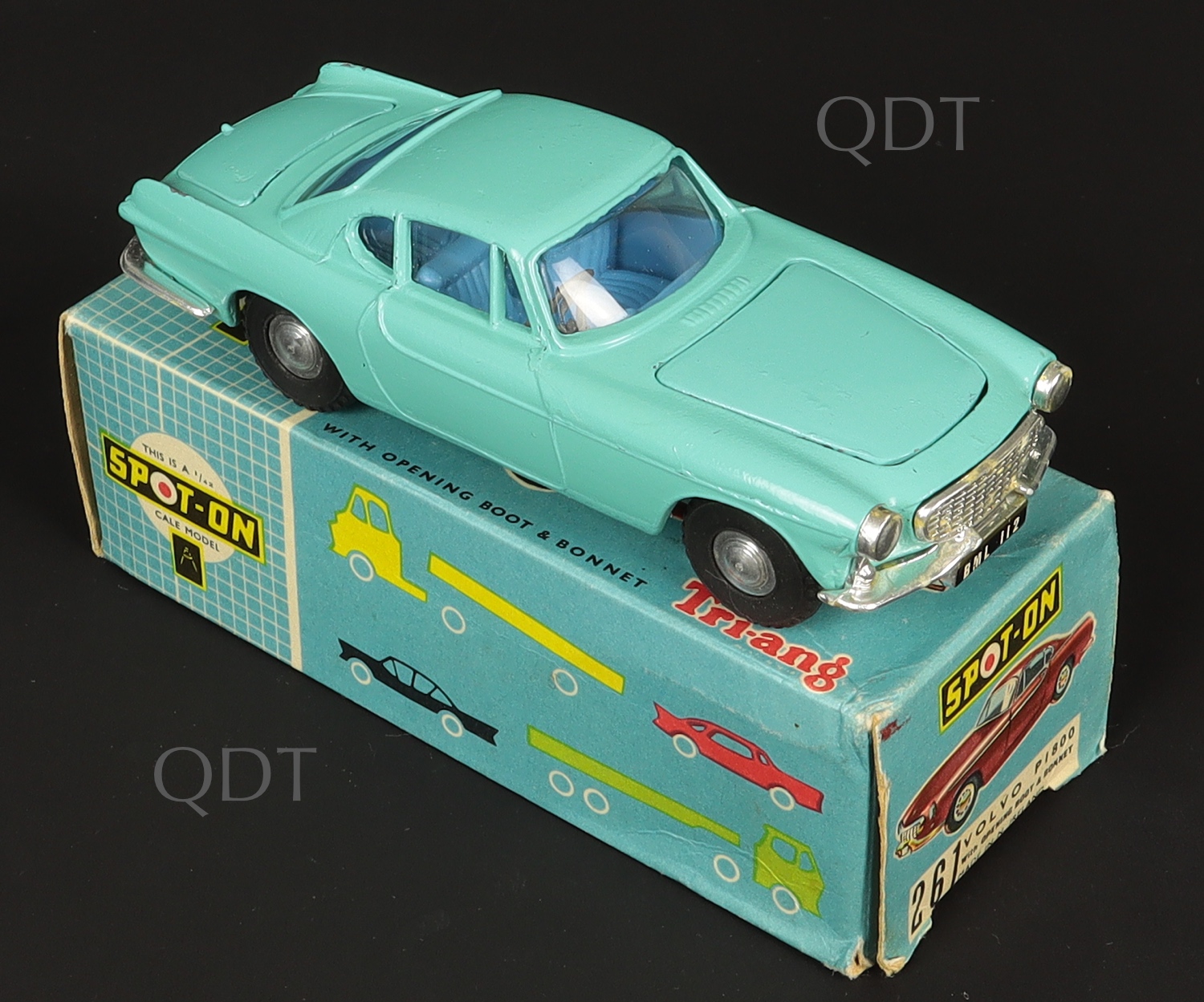 Volvo P1800 by Spot-on Models, No. 261. TURQUOISE issue with LIGHT BLUE interior. Near mint plus/boxed. With Collector's Card & Leaflet. From The Borders Collection. QDT starting bid £200. Please note that QDT apply 12.5% buyer's commission.
