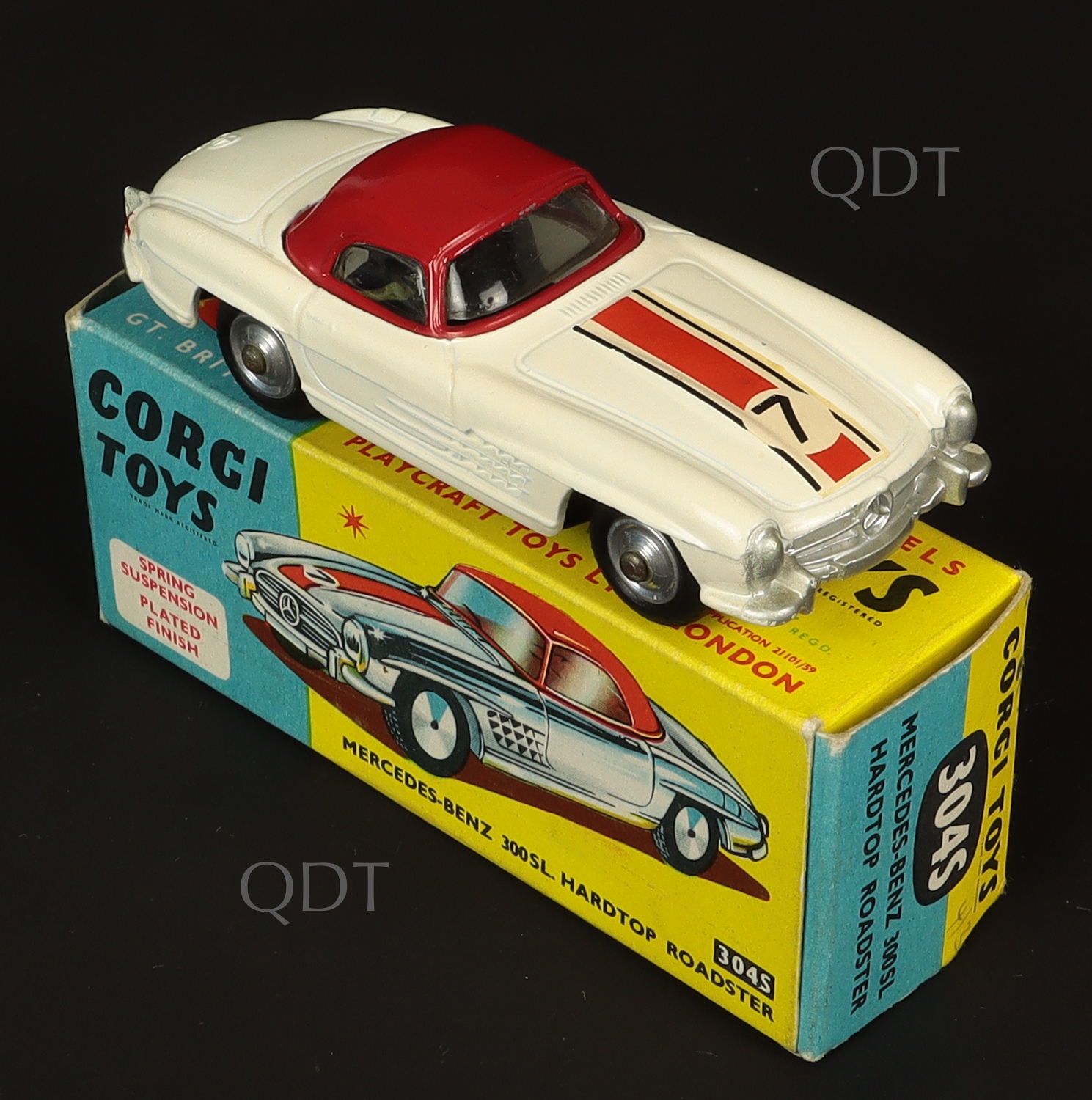 Mercedes-Benz Hardtop Roadster by Corgi Toys, No. 304S. Very near mint/boxed. Very scarce issue in white with a red roof. Starting bid £500. Please note that QDT apply 12.5% buyer's commission.