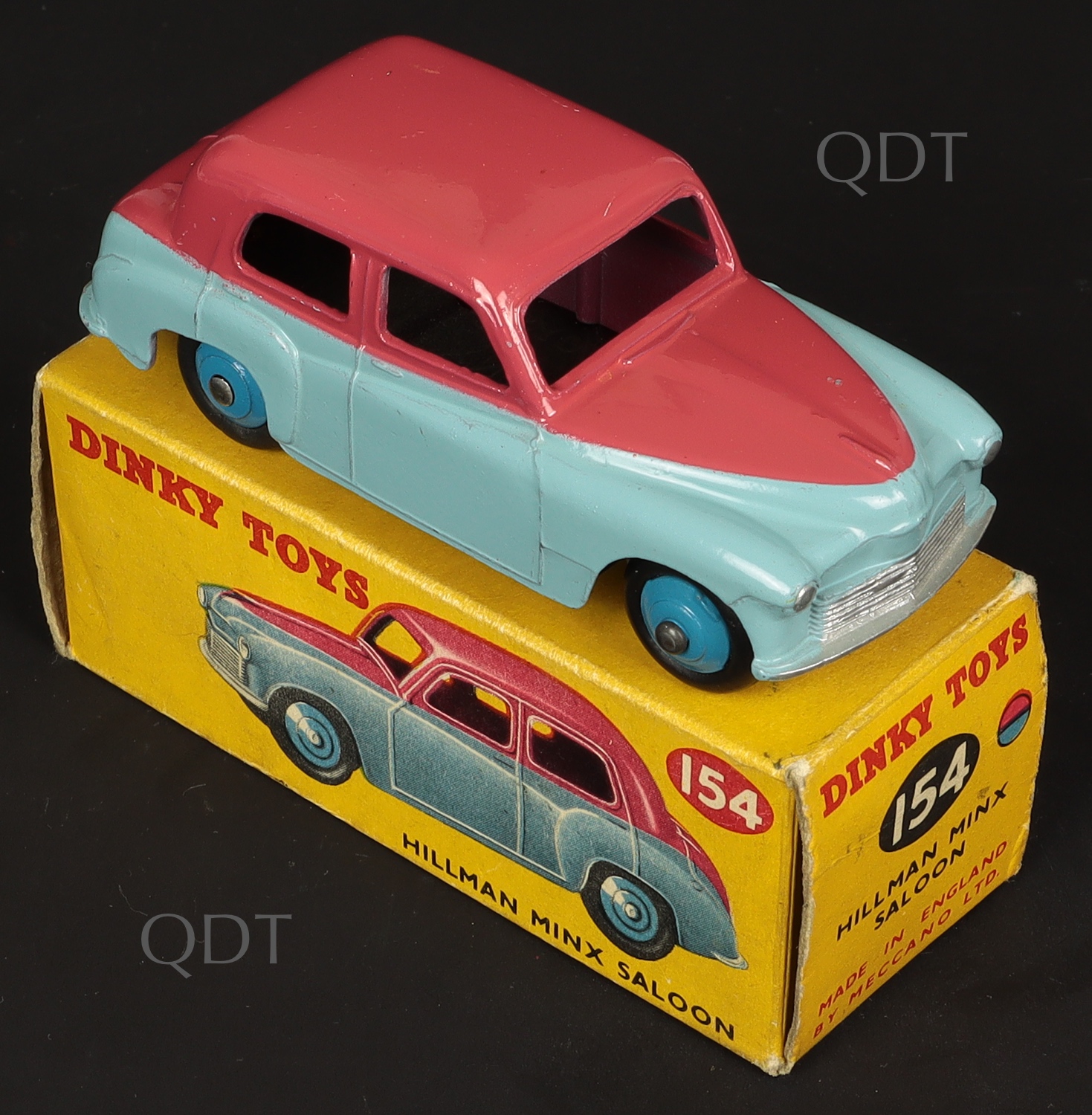 Hillman Minx Saloon by Dinky Toys, No. 154. Very near mint/boxed (wear). Scarce two-tone issue in pale blue and cerise. From The Berlin Collection.