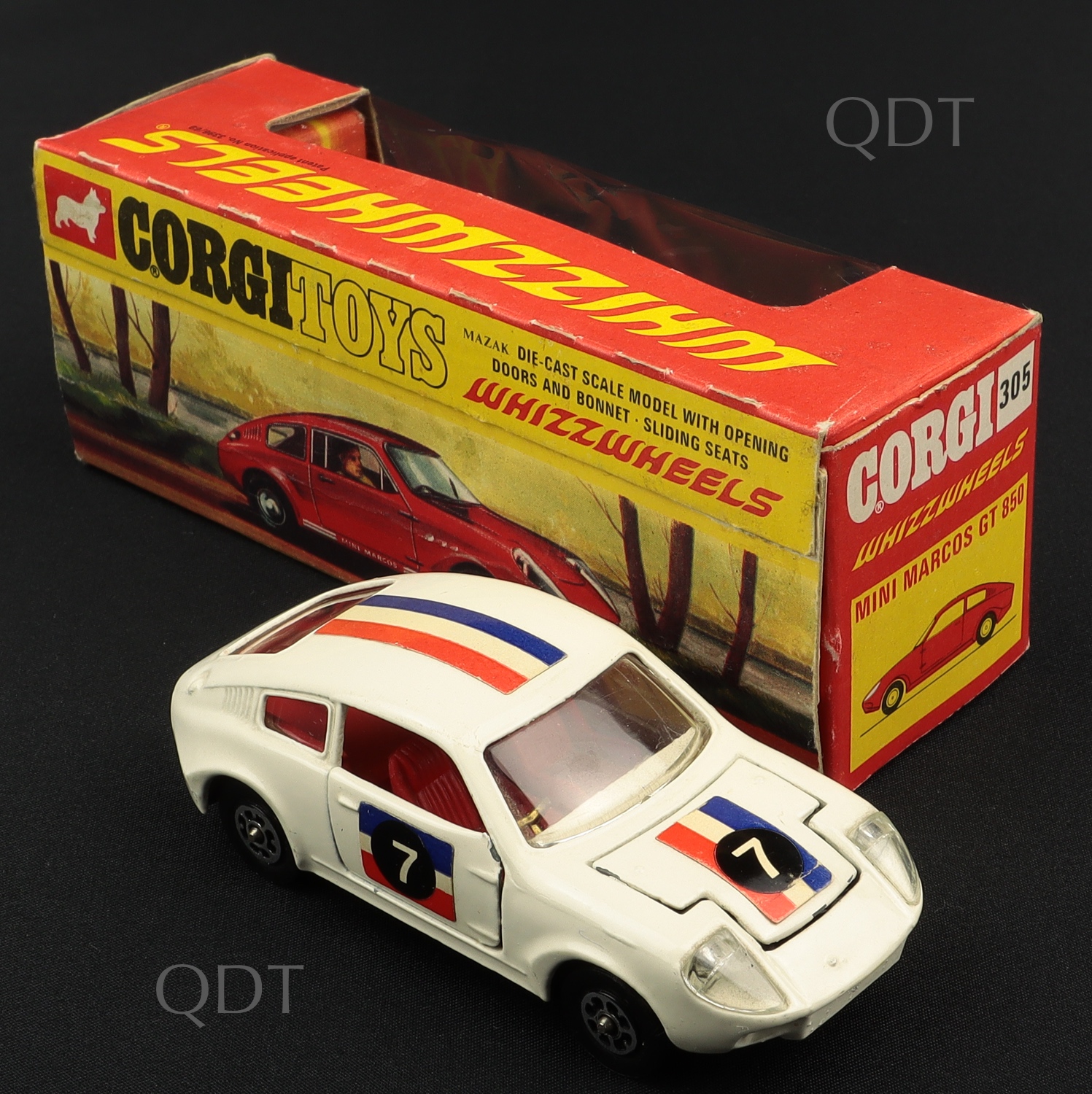 Mini Marcos GT 850 by Corgi Toys, No. 305. BLUE-TOP LABEL on doors. Near mint plus/boxed. From The Berlin Collection.