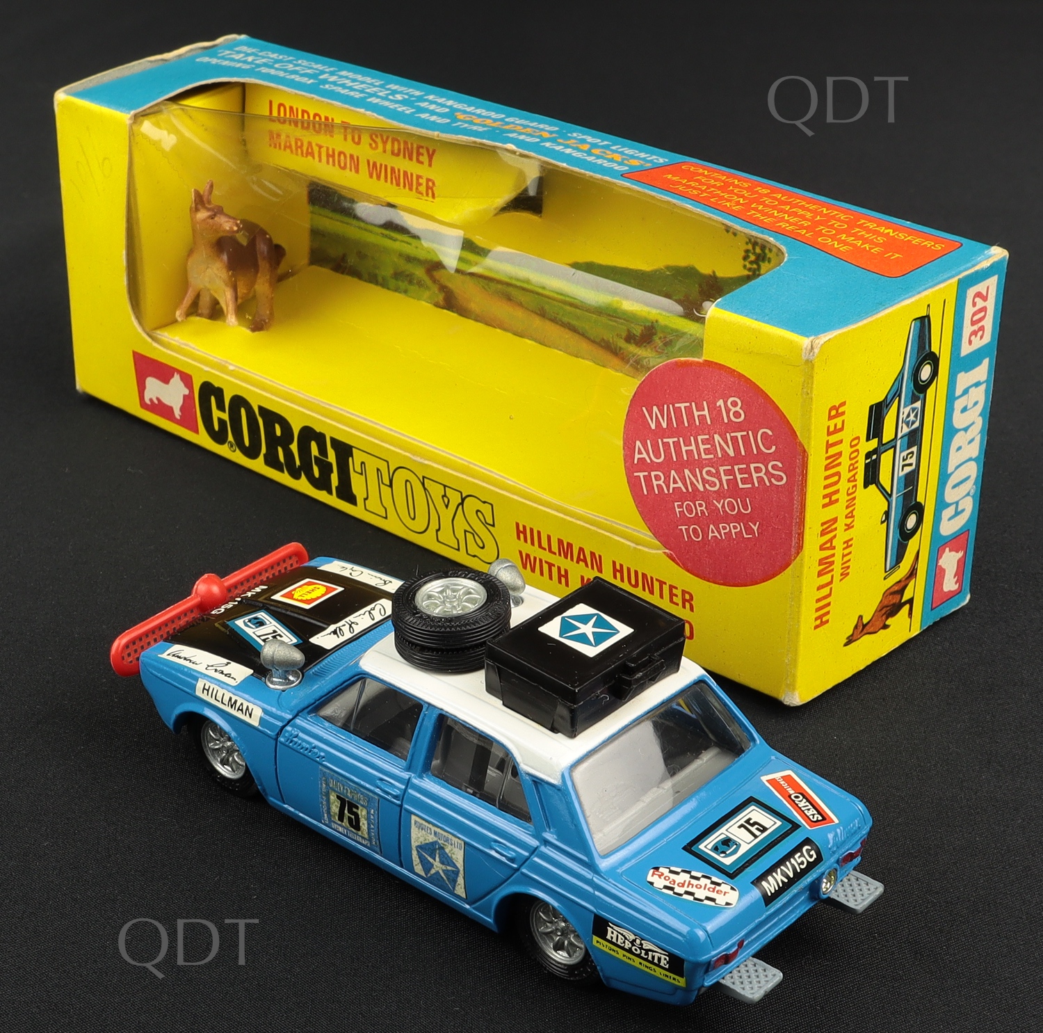 Hillman Hunter Rally Car With Kangaroo by Corgi Toys, No. 302. Version with 'GOLDEN' Golden Jacks. Very near mint/boxed. With leaflet. 2nd issue box version WITHOUT 302 printed on box face etc. From Christoph's Collection.