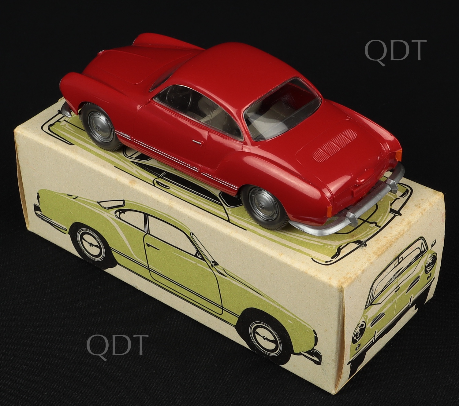 Superb old shop stock quality item, this plastic Karmann Ghia model has a rich deep red finish, grey seating, black steering wheel, window glazing.