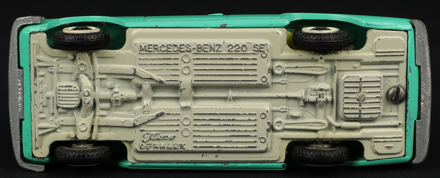 Mint green finish with a lemon interior, this Tekno Mercedes 220 SE model is in close to mint paint finish, an intact bonnet emblem and white wall tyres (silver wheels). Original treaded tyres run well.