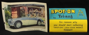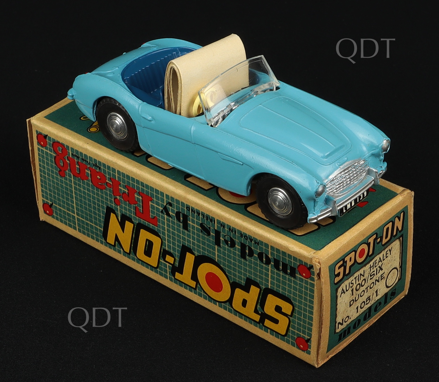 Austin-Healey "100-SIX" by Spot-on Models 105/1. Scarce MID-BLUE version, deep blue interior. Very, very near mint/boxed, with packing wedge, Collector's Card & promotional leaflet. An outstanding example! From The Tiverton Collection, a single-owner from new collection. Starting bid £350. Please note that QDT apply 12.5% buyer's commission.