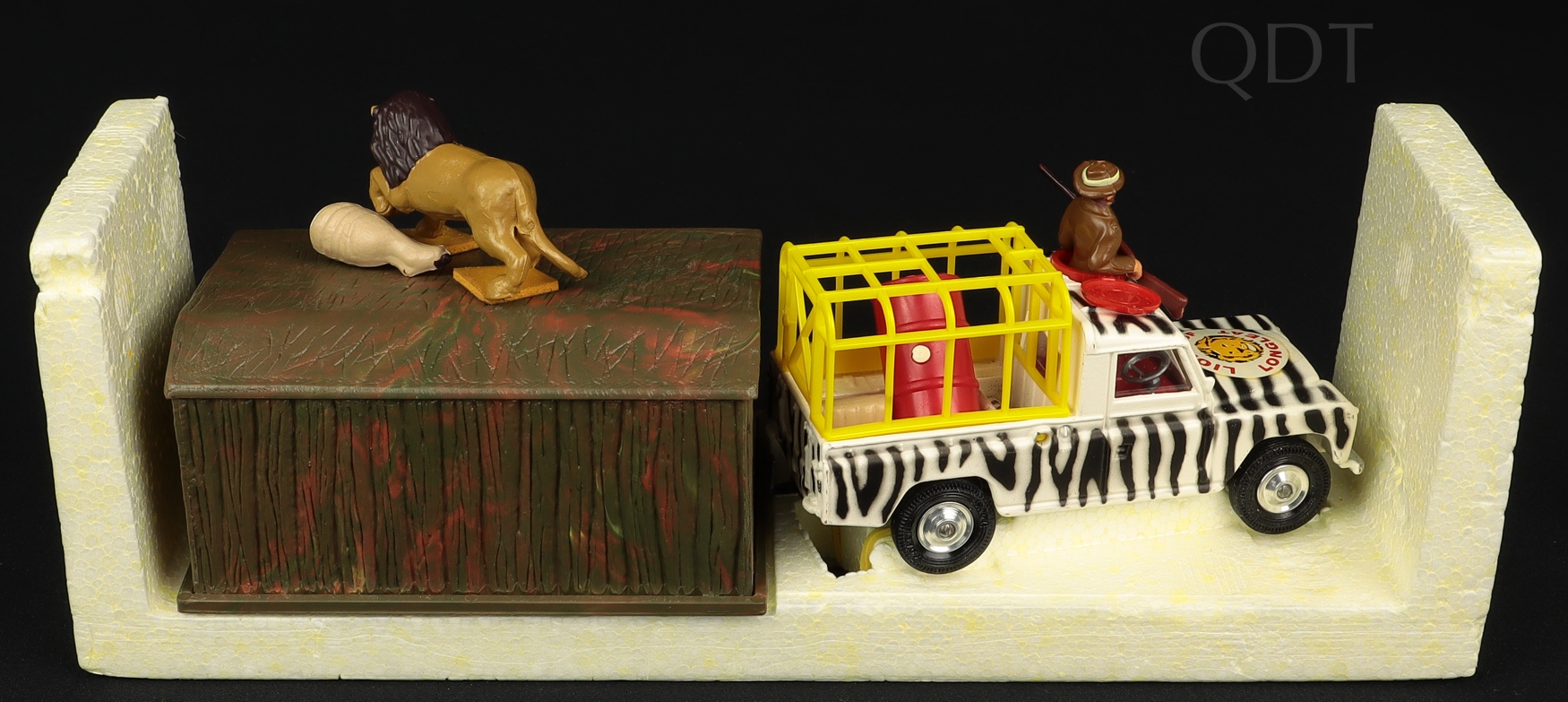 ’Zebra-striped Land-Rover with an intact circular ‘LIONS OF LONGLEAT’ label on the bonnet. Open hatch on the cab roof shows the keeper complete with the (usually missing!) rifle. Shiny spun wheels with suspension.