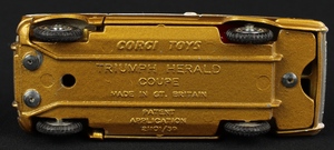 Missing from many Corgi collections. This Triumph Herald Coupe was issued for a very short time in gold and white with shaped spun wheels (this colour version is more usually found with flat spun wheels). Vivid red interior, opening bonnet (complete with the often missing detachable air filter). Suspension and well-shaped original tyres.