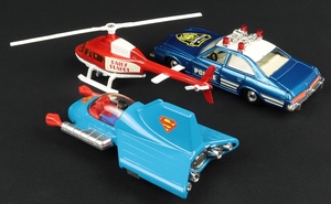 1) Corgi Toys 260 Superman Buick Police Car. This Metropolis Buick model from Corgi has a metallic blue paint finish, fresh labels and bright chrome. Near mint plus.