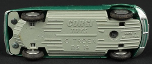 Citroen D.S. 19 by Corgi Toys, No. 210. Metallic green & black version - WITHOUT the mechanical 'bulge' on the base. Very near mint/boxed (scarce in the blue and yellow picture box). From The Berlin Collection.