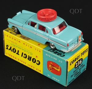 Always a popular Corgi model, this Austin A60 Driving School Car has a pleasing light blue finish with silver stripe and steering control on the roof. It comes complete with learner and instructor and was issued between 1964-68. Right hand drive version. Complete, bright “L” plates at front and rear.