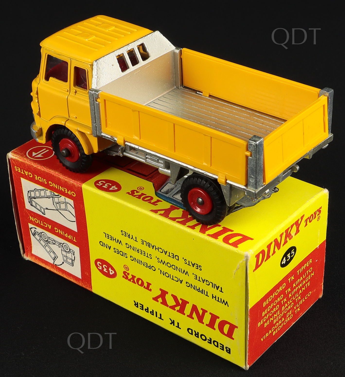 Bedford TK Tipper Truck by Dinky Toys, No. 435. Yellow, yellow roof, silver & yellow back, red plastic wheels, black tyres, silver base. Scarce issue. Very near mint/boxed, with packing card. From The Berlin Collection.