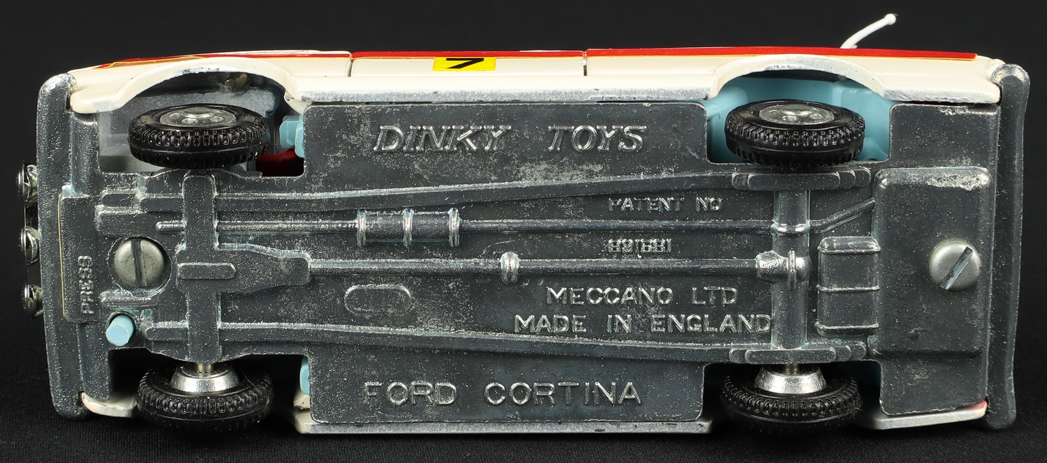 Lotus Cortina Rally Car by Dinky Toys, No. 205. Near mint plus/boxed. Cast wheels issue. From The QDT Vault.