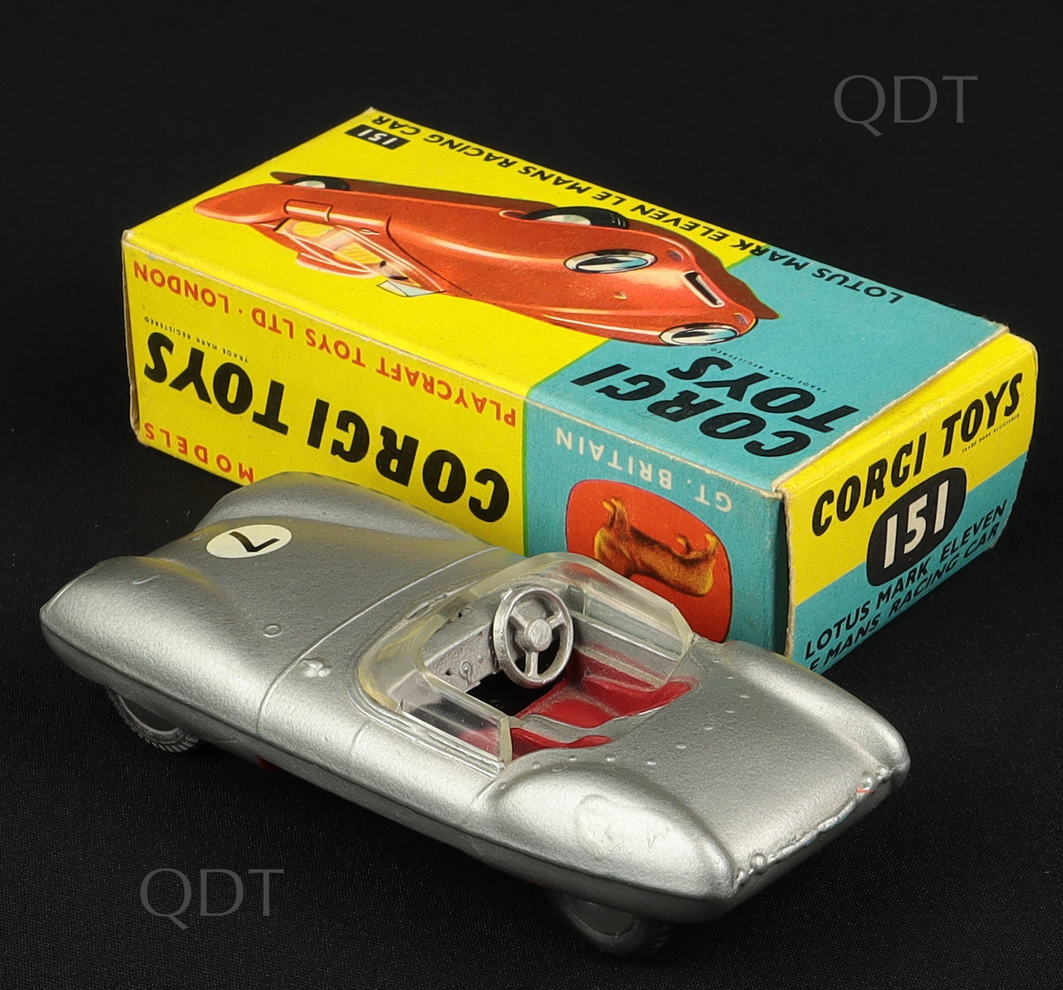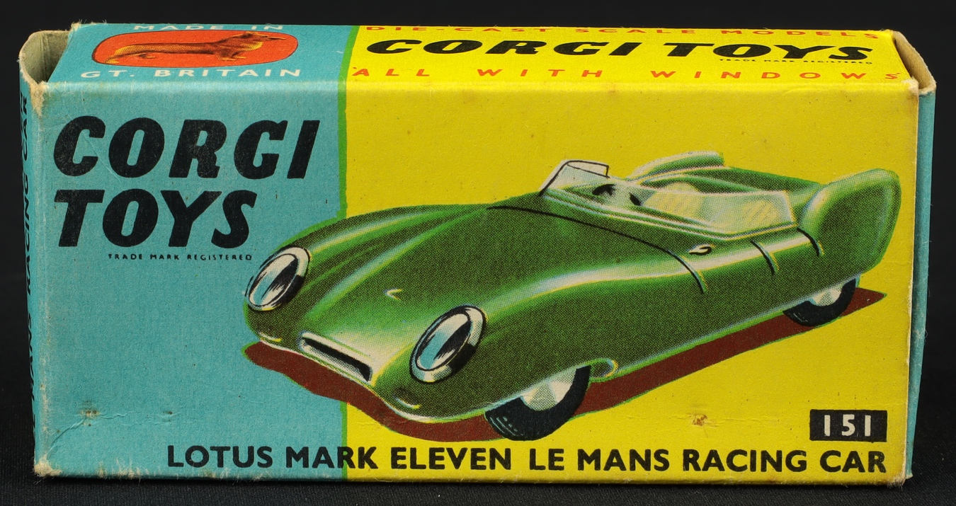 Lotus Mark Eleven Le Mans Racing Car by Corgi Toys, No. 151. Silver, with Racing Number 7 and clear screen. Very, very near mint/boxed. From The Berlin Collection.