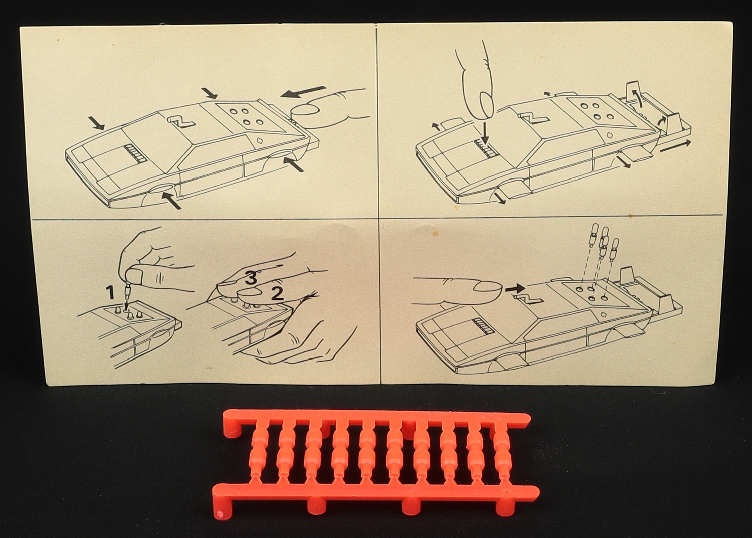 The ‘film strip’ header card box is very crisp and bright. The header card has the lightest crease on the reverse where the header meets the main body of the box. Tiny tear to the tuck-in part of one large end flap. Little storage creasing low down on one side. Original cellophane window has a little ruffling. Full sprue of missiles.