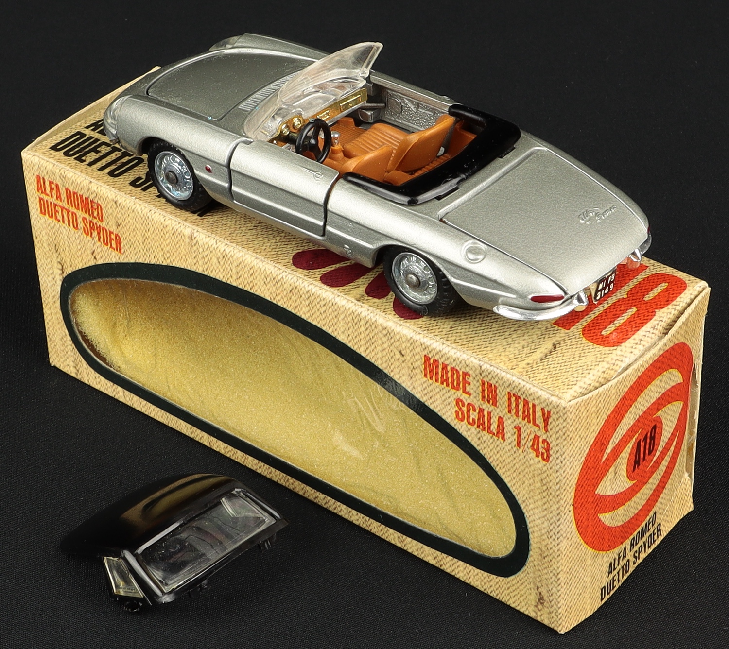 Alfa Romeo Duetto by Mebetoys Models, No. A18. Scarce SILVER version with hard & soft tops. Very, very near mint/boxed, with packing foam. From The Berlin Collection.