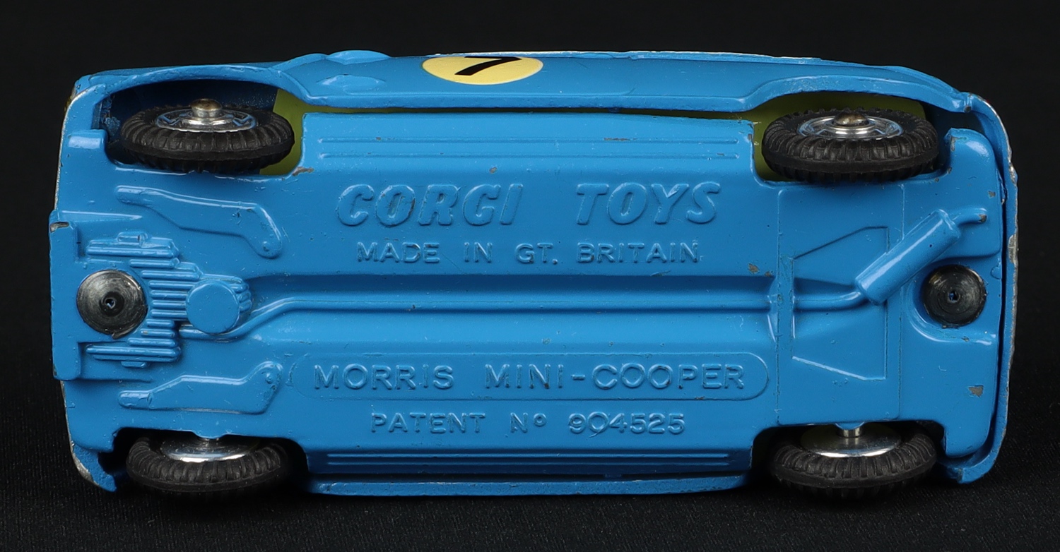 Morris Mini-Cooper Competition Model by Corgi Toys, No. 227. Very, very near mint/boxed. Scarce issue in blue with a white roof only, blue bonnet. Bold racing number 7 version. From The Reference Collection.