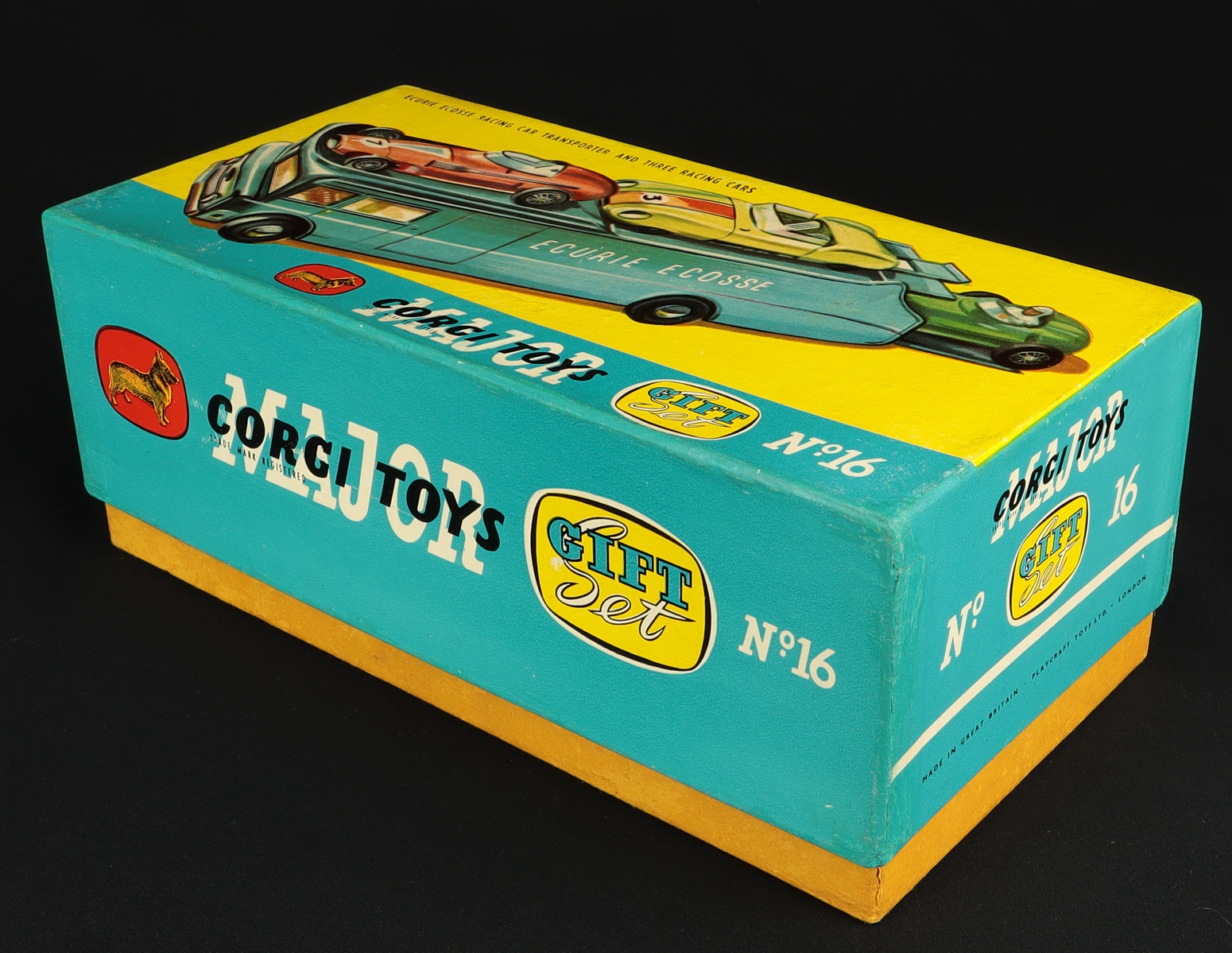 Ecurie Ecosse Racing Car Transporter & Three Racing Cars by Corgi Toys , Gift Set No. 16. Scarce late SUSPENSION issue (1965) with LIGHT METALLIC BLUE Transporter, red lettering with LEMON interior. Very near mint -very, very near mint/boxed. With Leaflet, Instruction Slips & packing pieces. From The Heart of England Collection. Starting bid £450. Please note that QDT apply 12.5% buyer's commission.