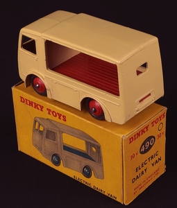 Electric Dairy Van 'Express Dairy' by Dinky Toys, No. 30V/490. A rare find in BEIGE with ORANGE-RED LETTERING, flatbed and wheels. PLEASE SEE NEW LEAD IMAGE TO SHOW COLOUR CONTRAST. Very near mint/boxed (dual-numbered). With C.Gibson written and date of purchase. Another First for QDT! From The 25 Year Collection in California. Starting bid £175. Please note that QDT apply 12.5% buyer's commission.
