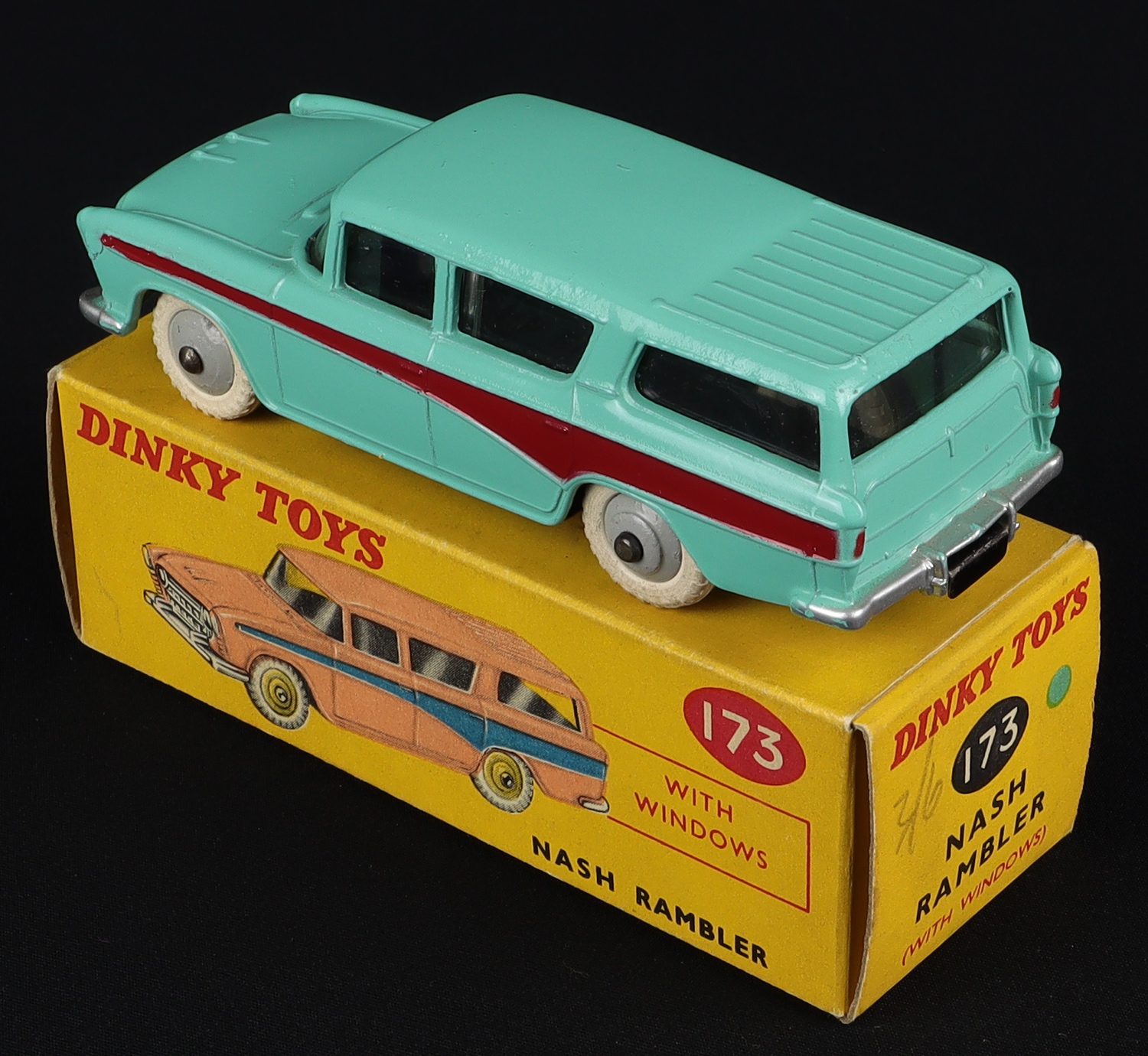 Nash Rambler Station Wagon by Dinky Toys, No. 173. Turquoise and red, cast wheels. Very near mint/boxed. From The Fenman Collection.