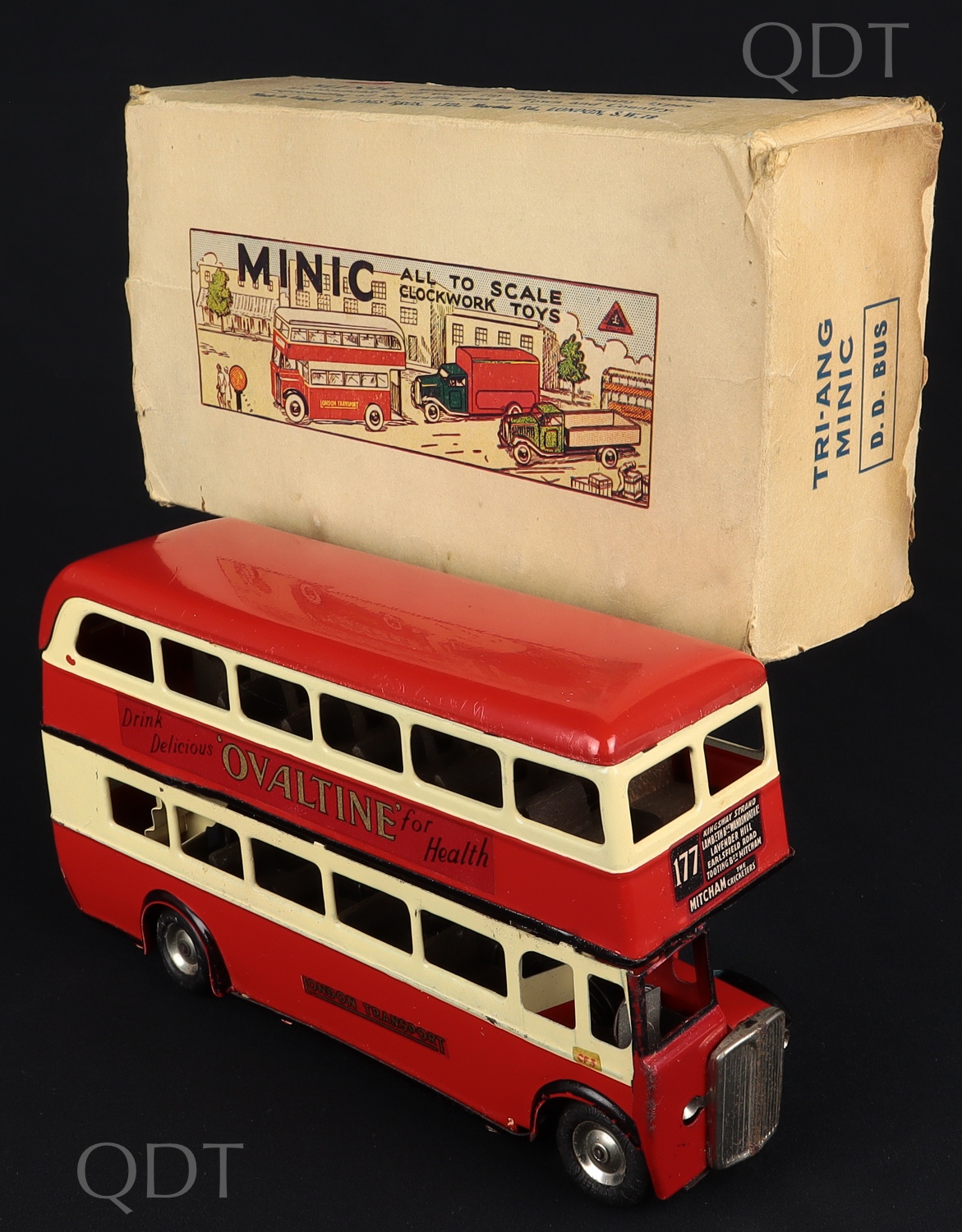 1948 issue Tri-ang Minic 60M Double Decker Bus. Red and cream with 'BOVRIL' & 'OVALTINE' advertisements. With working clockwork function. Scarce. Near mint/boxed (wear). An impressive Minic Bus from The West Sussex Collection. Starting bid £175. Please note that QDT apply 12.5% buyer's commission.