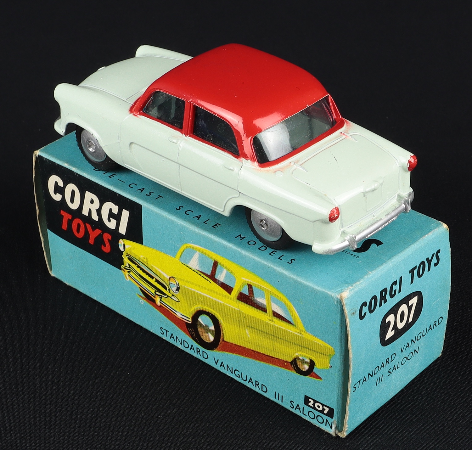 Standard Vanguard III Saloon by Corgi Toys, No. 207. Very pale blue-green & red INCLUDING WINDOW PILLARS, MATTE black base. Scarce. Very near mint/boxed. From The Reference Collection.