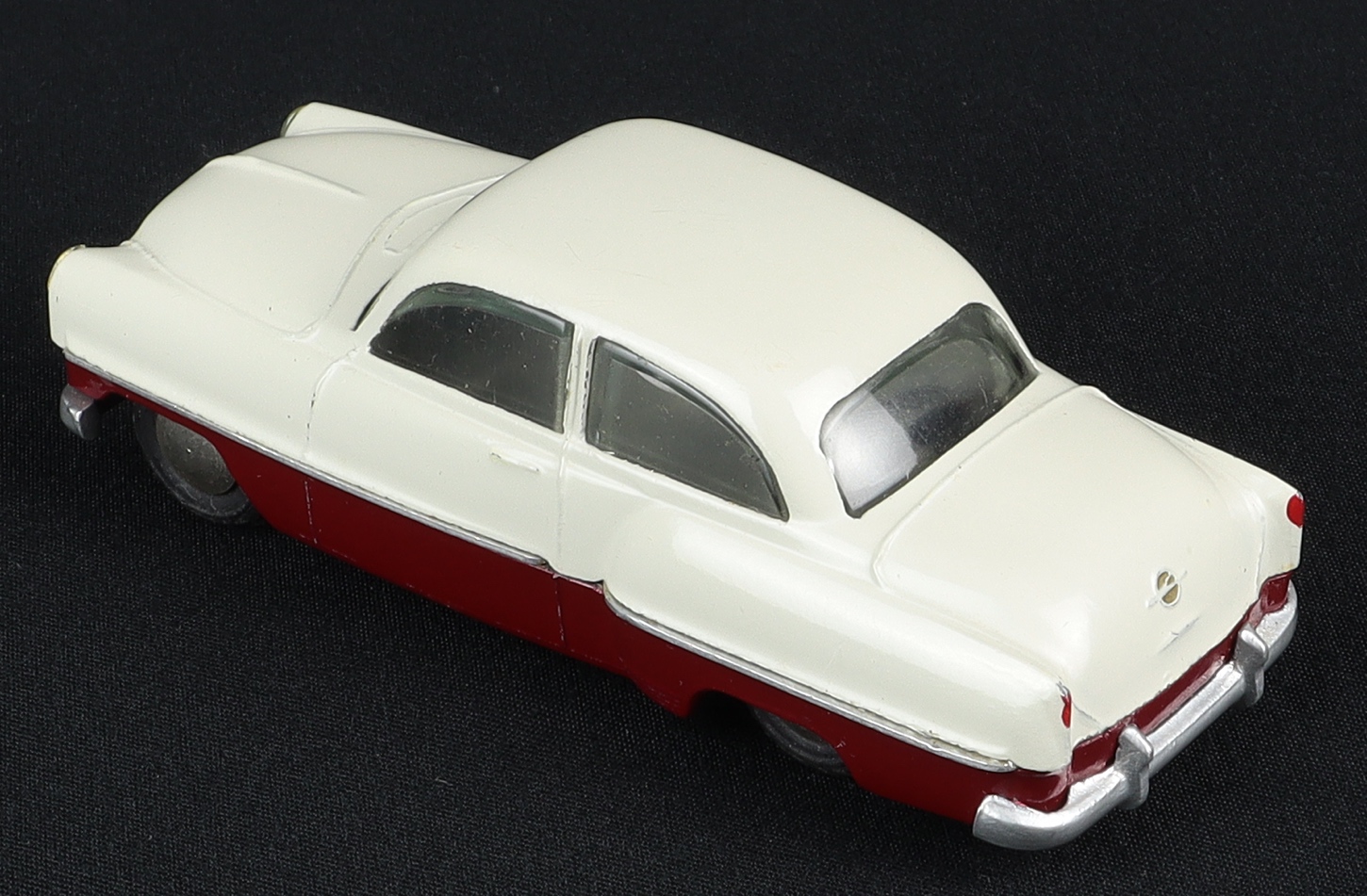 Rare to come to the market place, this Tekno Opel Olympia Rekord model is finished in a delicate pale oyster shade with a rich maroon lower half. with silver trim, window glazing, front and rear lights detail (tiny portion of one headlight missing), and shiny wheels. Original well-shaped tyres. Delicate Opel mascot with a touch of gold highlight. All original.