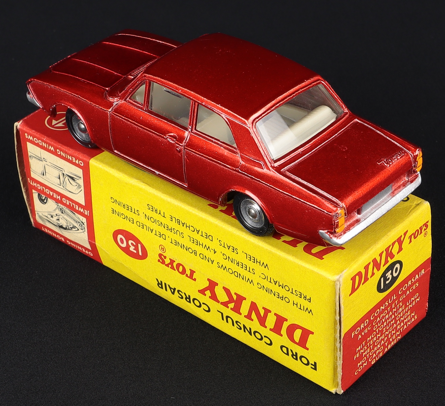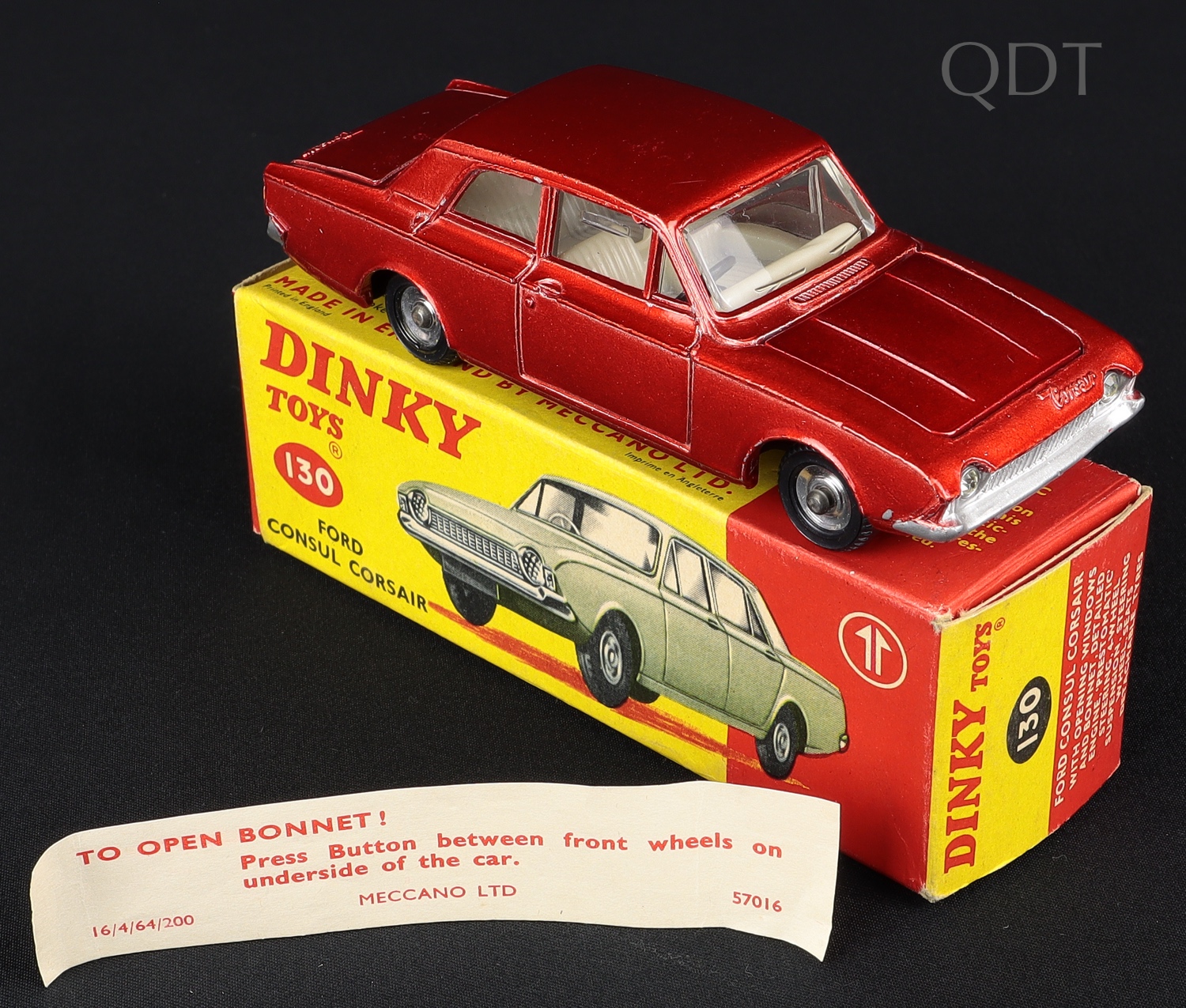 Ford Consul Corsair by Dinky Toys, No. 130. Metallic red 1st issue. Near mint plus/boxed, with informative slip.