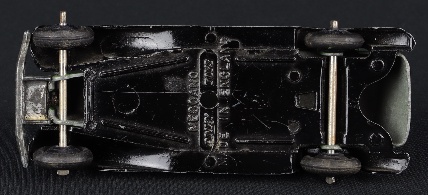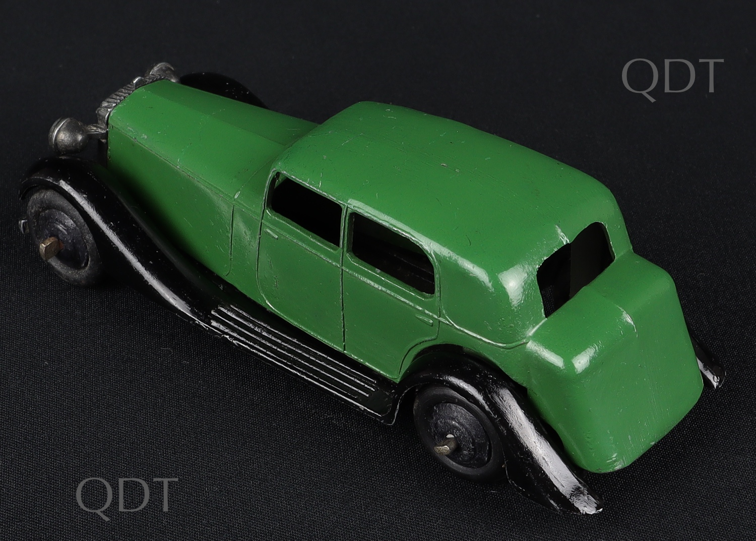 Issued between 1946-50 with this plain closed chassis. A gleaming deep green and black finish, intact radiator, headlight and bumper assembly, black ridged wheels, bright axles. Smooth original tyres run well.