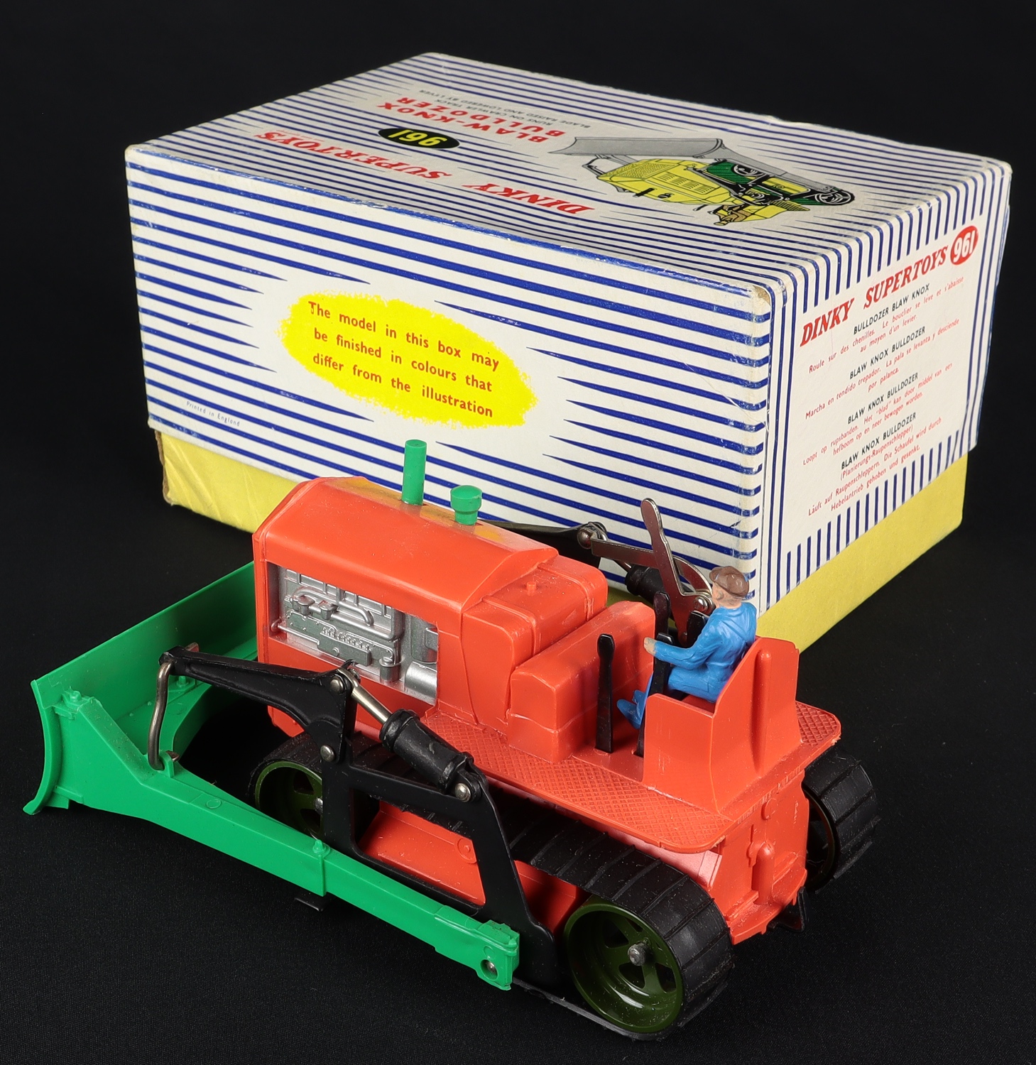 Blaw-Knox Bulldozer by Dinky Toys, No. 961. Rare late plastic issue in orange & green with shiny base. Mint/boxed, with both packing pieces and correct yellow box lower. From The QDT Vault. Starting bid £200. Please note that QDT apply 12.5% buyer's commission.