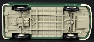 This VW Kombi model has a grey-green finish, white seating & steering wheel, white trim, window glazing.