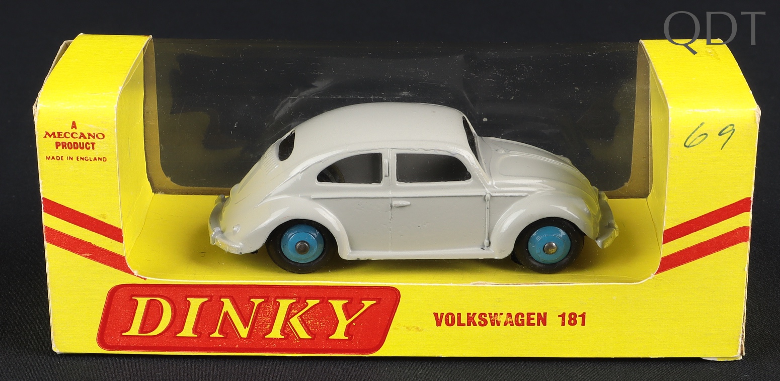 Volkswagen by Dinky Toys, No. 181. Pale grey, blue wheels. Early issue and a very scarce find in the EXPORT box. Very, very near mint/boxed. From The Reference Collection.