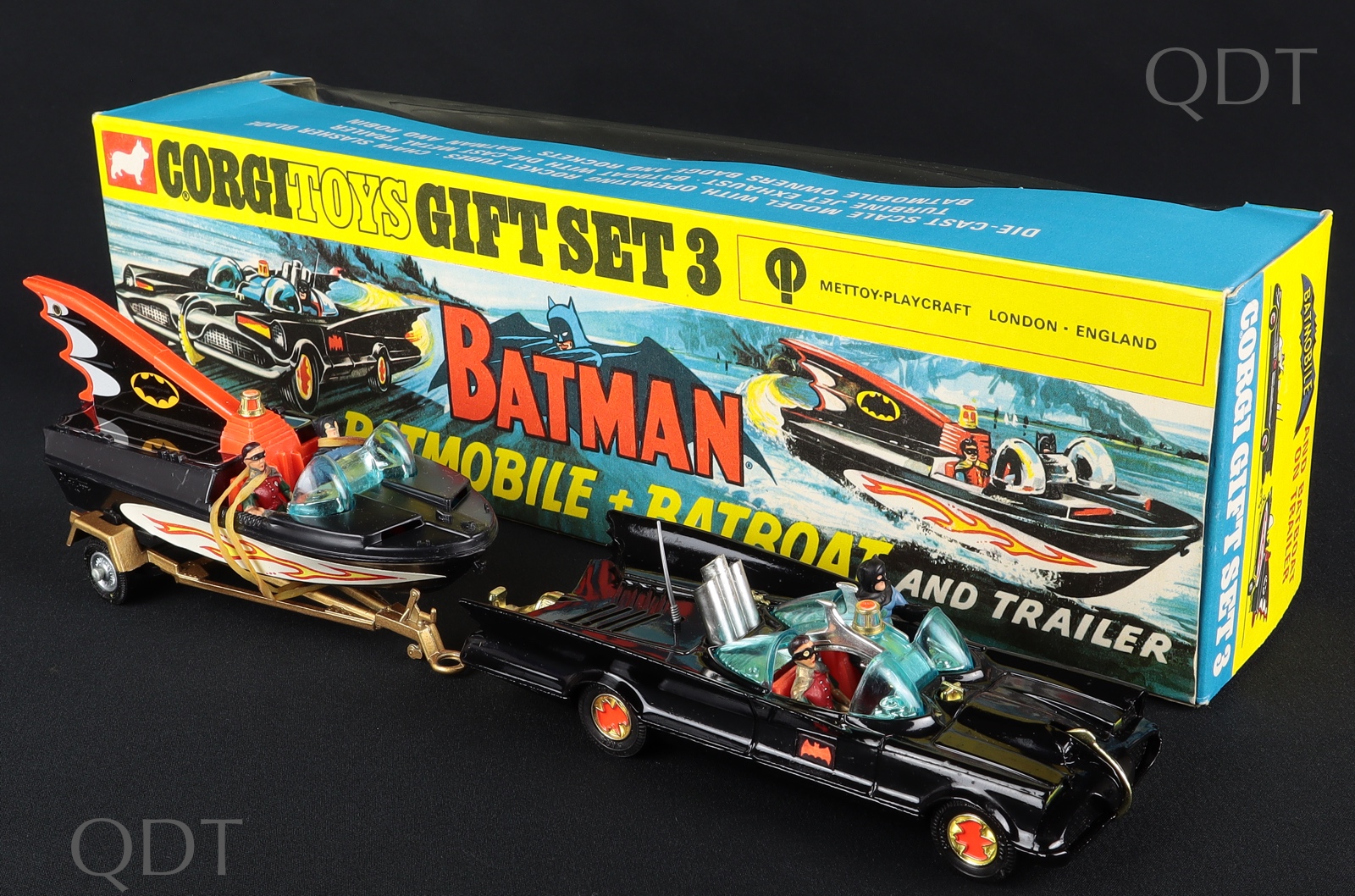 2) Batboat sits atop the gold trailer with cast wheels. Complete with both seated figures of Batman and Robin. More desirable ‘tin fin’ version (later issues were plastic). Mint condition with remains of the original elastic band fixings which kept both figures in situ.