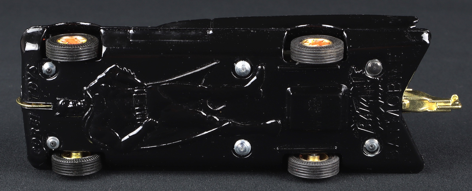 1) Batmobile in gleaming gloss black finish with both original figures of Batman and Robin. Tow hook version. Bright red ‘bat’ wheels, gleaming chrome, bright gold parts. Correct that this version (being the last made with the desirable bat wheels) has less pointed rear fins and intense gold-coloured parts. With suspension on all four wheels.