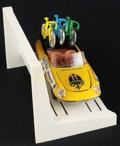 Such a scarce Alfa Romeo Duetto ‘GIRO D’ITALIA’ in bright yellow with complete colourful labels throughout. Brown seating, silver trim. Black bonnet rear section which holds the three racing cycles.