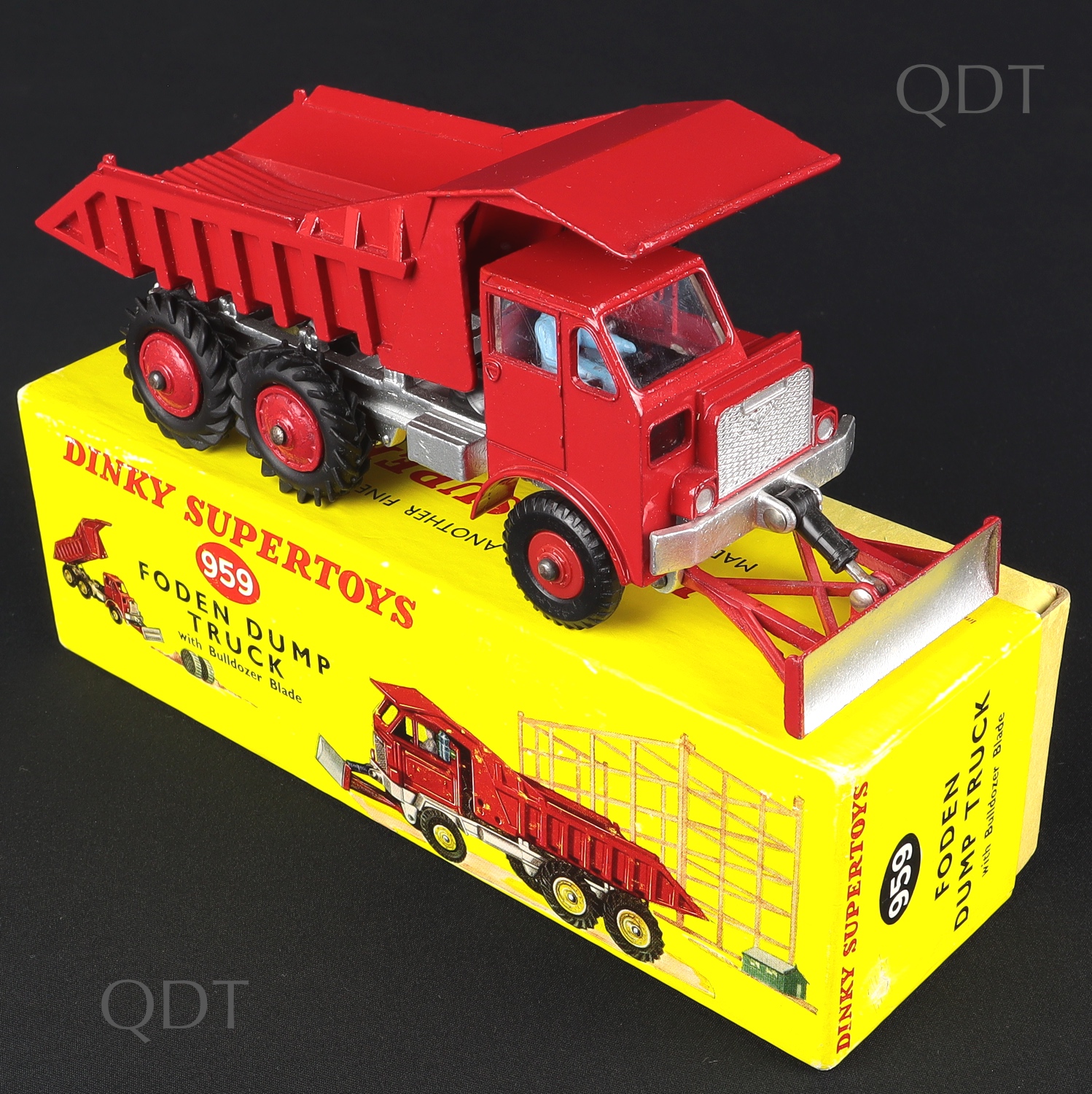 Foden Dump Truck with Bulldozer Blade by Dinky Toys, No. 959. Very near mint/boxed (lift-off lid and YELLOW base). With card packing piece. Red, with silver chassis. Smooth 'overhang' and red wheels issue. From The Reference Collection.
