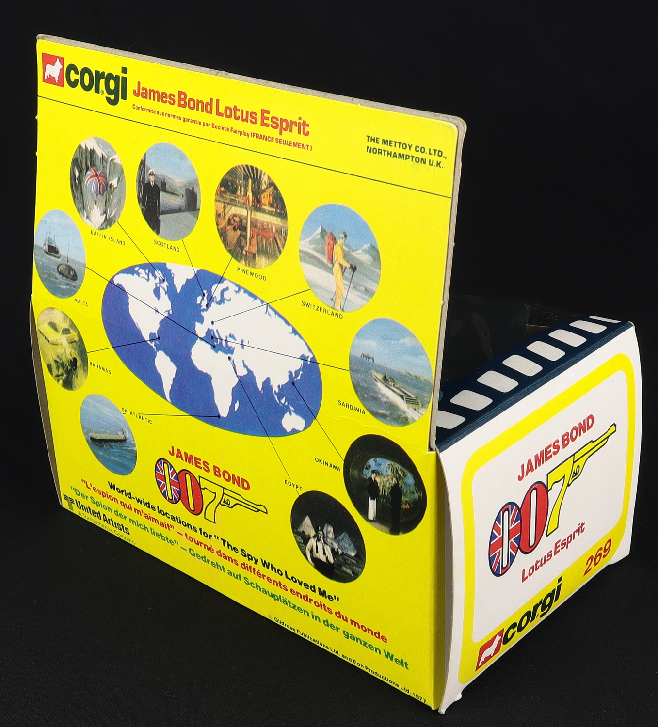 James Bond Lotus Esprit by Corgi Toys, No. 269. Very, very near mint/boxed, with missiles. Version WITH the 'New' tag on the box . Later issue correct without hammer & sickle detail and instructions printed on base. Pristine card stand! From The QDT Vault.
