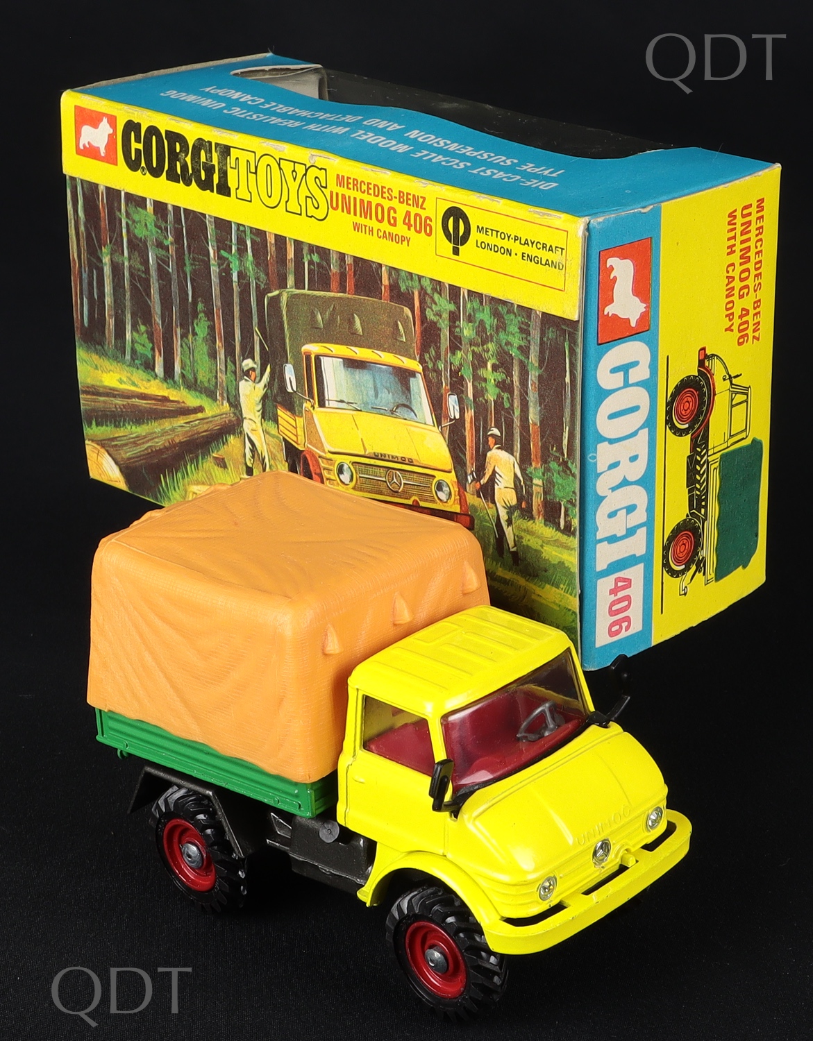Mercedes-Benz Unimog 406 with Canopy by Corgi Toys, No. 406. Very near mint /boxed. Early issue. Scarce colours - and another First for QDT. From The Pennsylvanian Collection. Starting bid £75. Please note that QDT apply 12.5% buyer's commission.