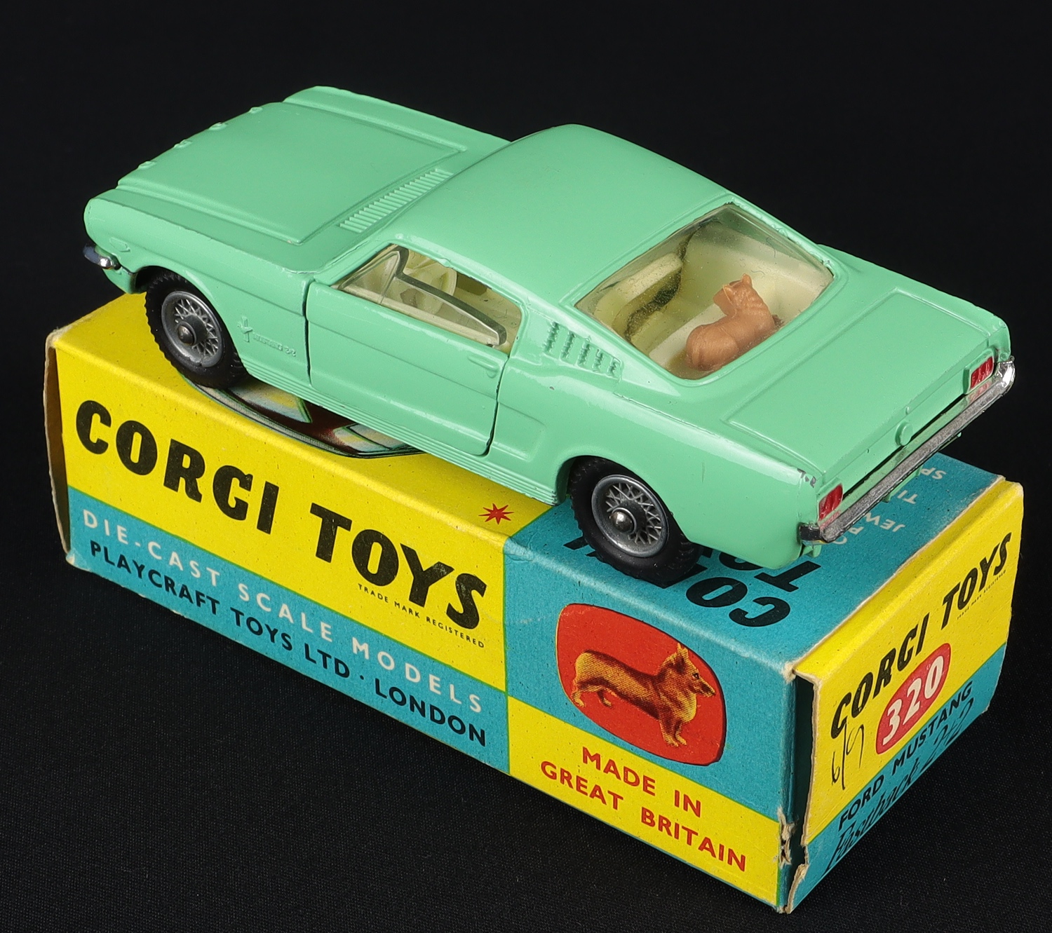 Ford Mustang Fastback 2+2 by Corgi Toys, No. 320. Near mint plus/boxed. Light green version with spoked wheels. From A Phenomenal Collection.