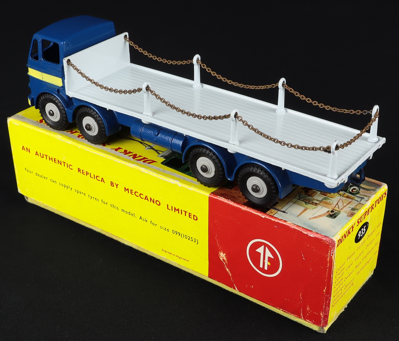 Leyland Octopus Flat Truck with Chains by Dinky Toys, No. 935. Rarest version in BLUE, GREY & LEMON with grey plastic wheels. Very near mint/boxed. Made during 1963-1964 only. From A Phenomenal Collection.