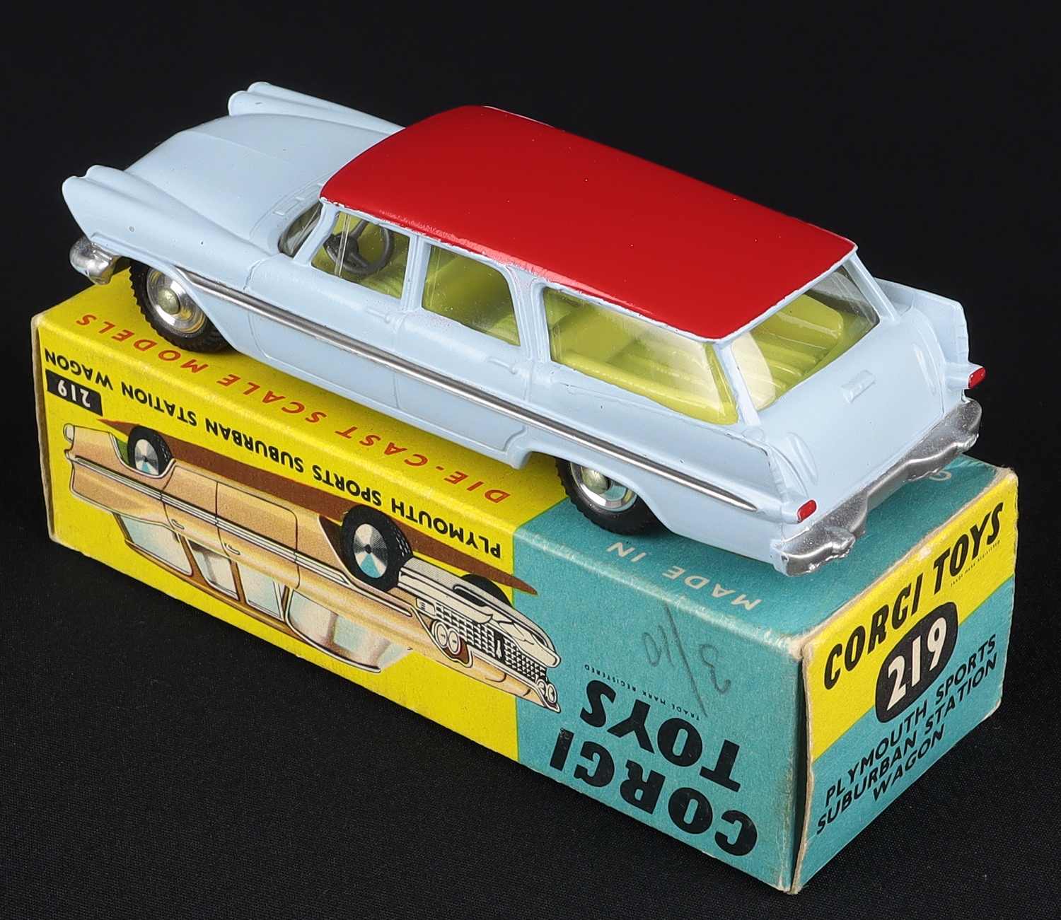 We have seen several Corgi 445 Plymouth Sports Suburban Station Wagons (suspension) issued in these earlier boxes for the non-suspension issue. Believe that Corgi was simply using up spare 219 boxes.