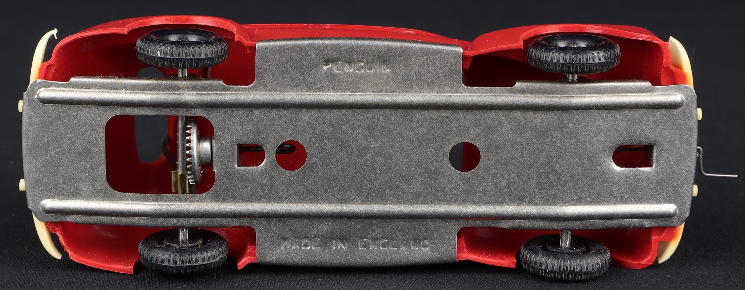 A delightful and so scarce Penguin (Tri-ang) Series 4 model in vivid red plastic. A uniquely fascinating scale model with rubber (band) drive, using the starter handle in conjunction with the rear wheels in order to propel the car along.