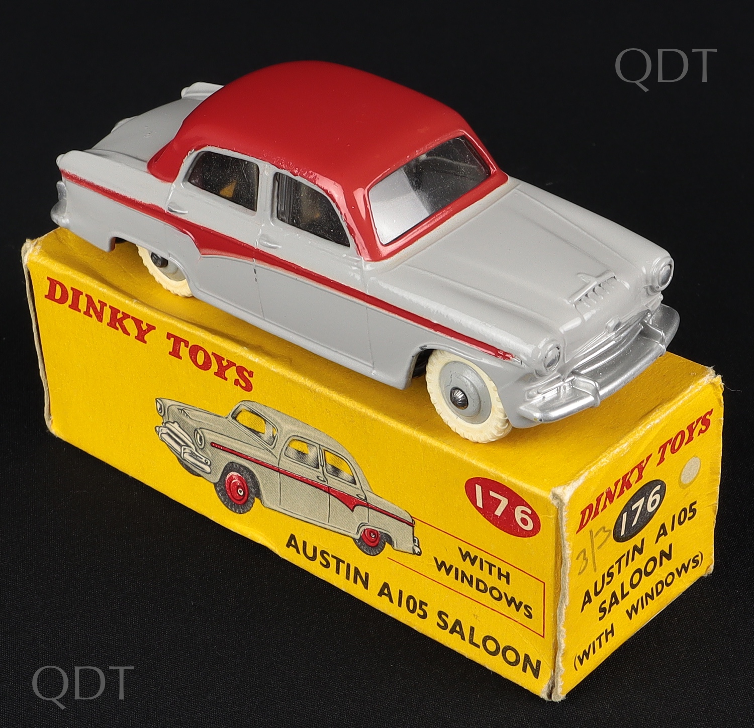 Austin A105 Saloon by Dinky Toys, No. 176. Very near mint/boxed. Grey with red roof and side flashes, grey cast wheels. From The QDT Vault.