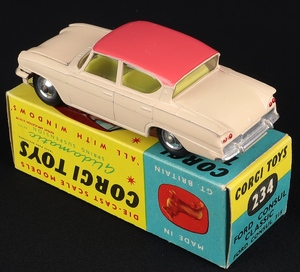 Ford Consul Classic by Corgi toys, No. 234. Light FLESH PINK issue & bright pink roof. Scarce. Very near mint/boxed. From The Gower Collection.