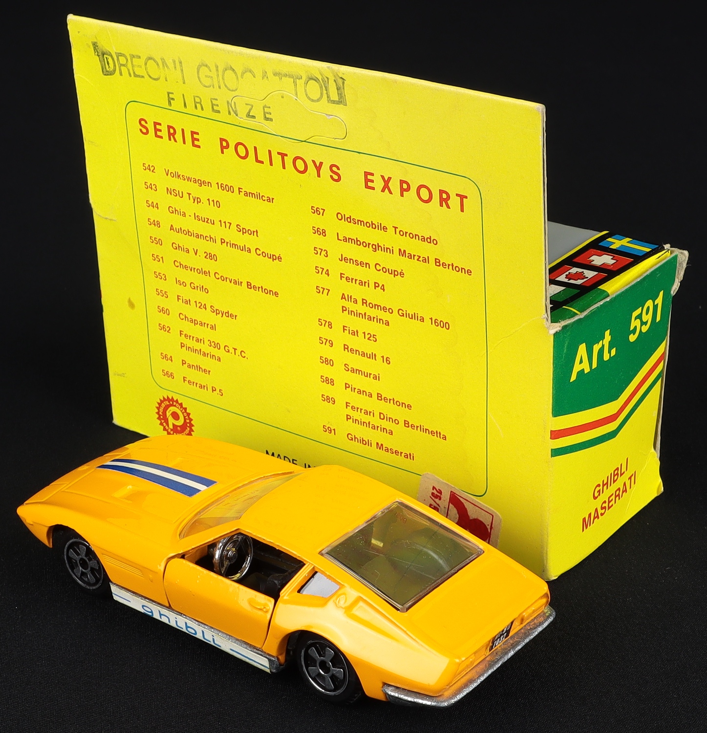 Ghibli Maserati by Politoys Models, No 577. Very near mint/boxed. From The QDT Vault. Starting bid £75. Please note that QDT apply 12.5% buyer's commission.