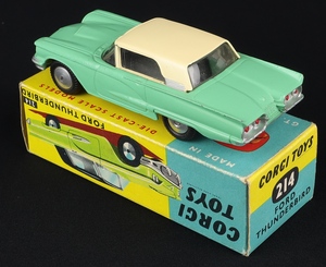 Ford Thunderbird by Corgi Toys, No. 214. Gloss green & cream. Very near mint/boxed. Flat spun wheels, 1st issue with 1959 cast into the rear numberplate. Scarce. From The Berlin Collection.