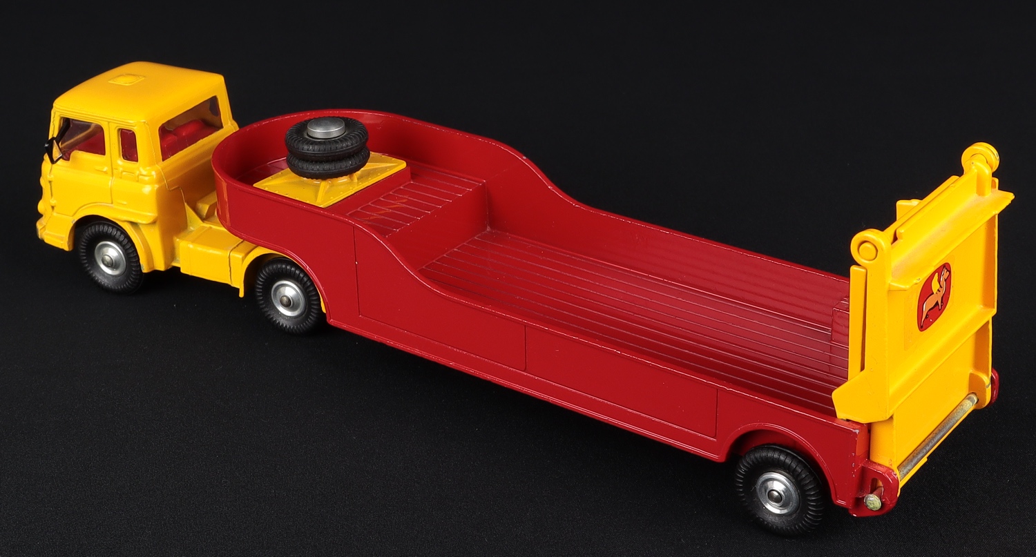 In fine, all original condition, with both wing mirrors intact notably and both still have the little reflective pieces in place too. Close to perfect original yellow and red finish with bright metal parts, both spare tyres, and a delightful Corgi dog logo at the rear folding ramp (nick).